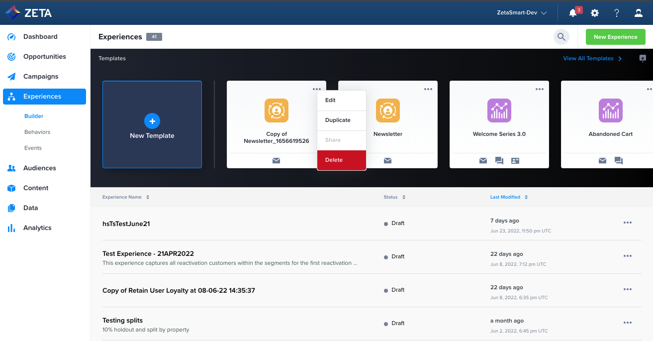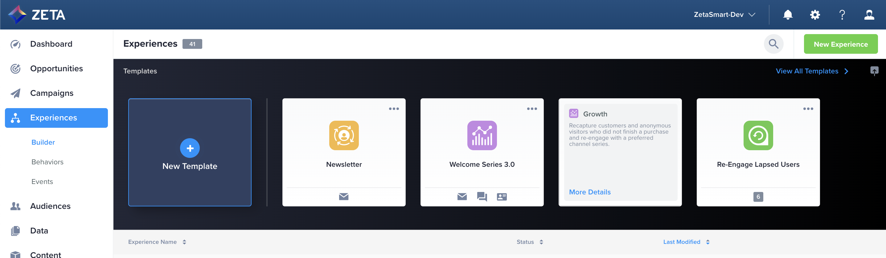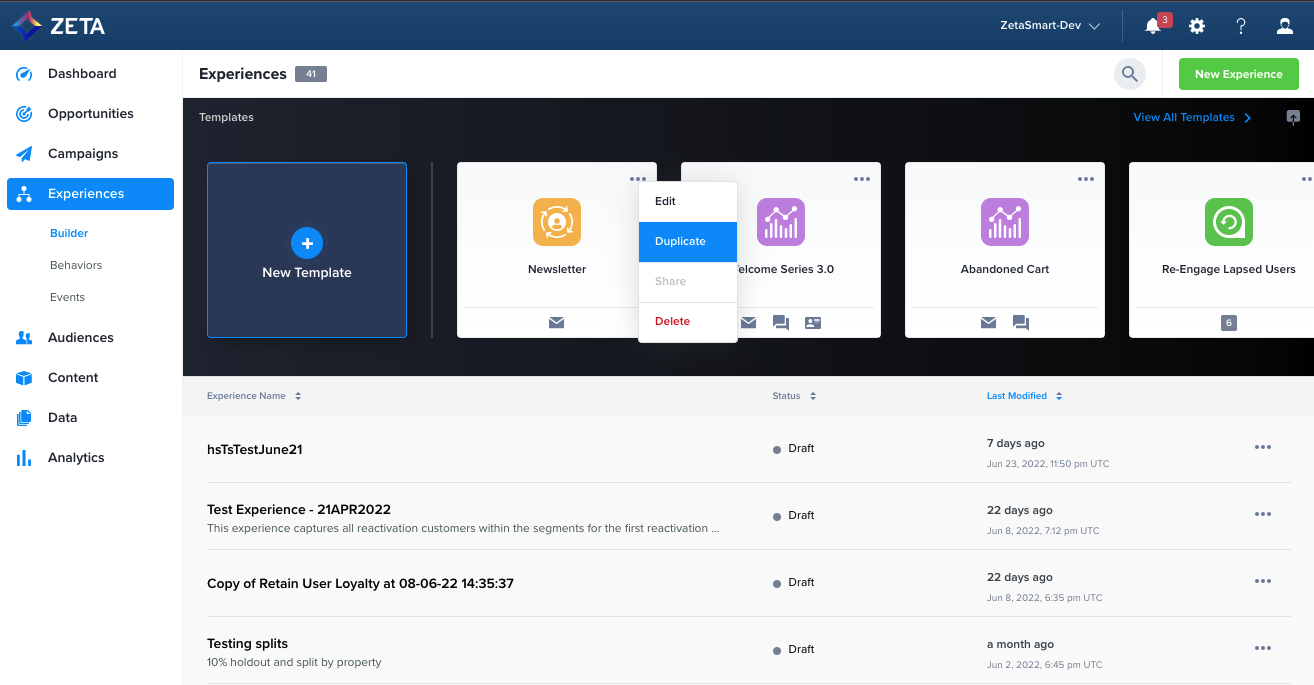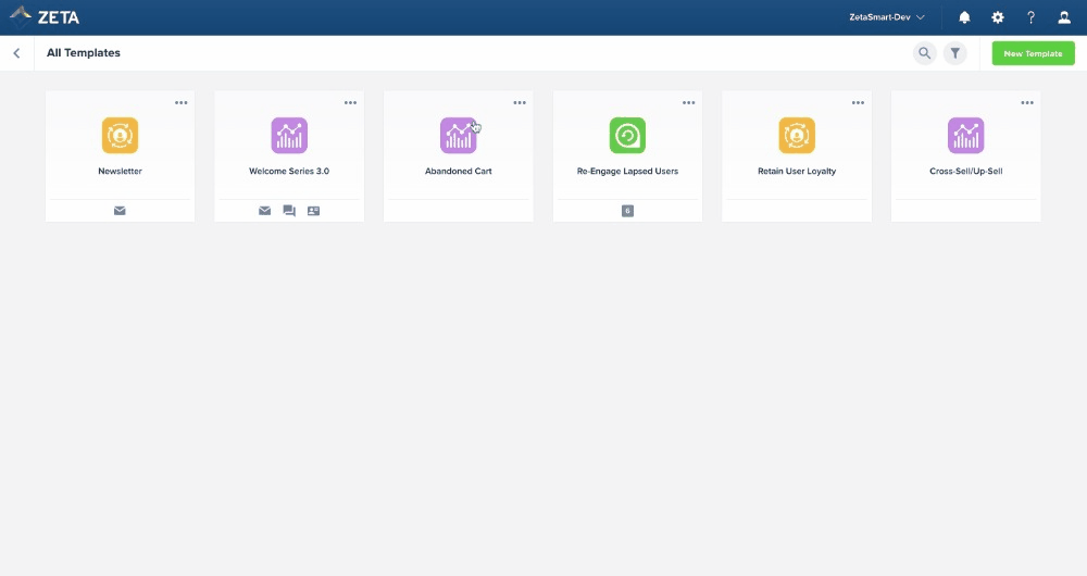 Zeta’s in-house marketing experts have created Experience Builder Templates to leverage best practices and the ZMP’s omnichannel capabilities to help users generate automation ideas and optimize setup time. For more advanced marketers in a Super User role, you can take advantage of this feature to provide templates for your teams and family of accounts, flexibly scaling your automation tactics across your business.