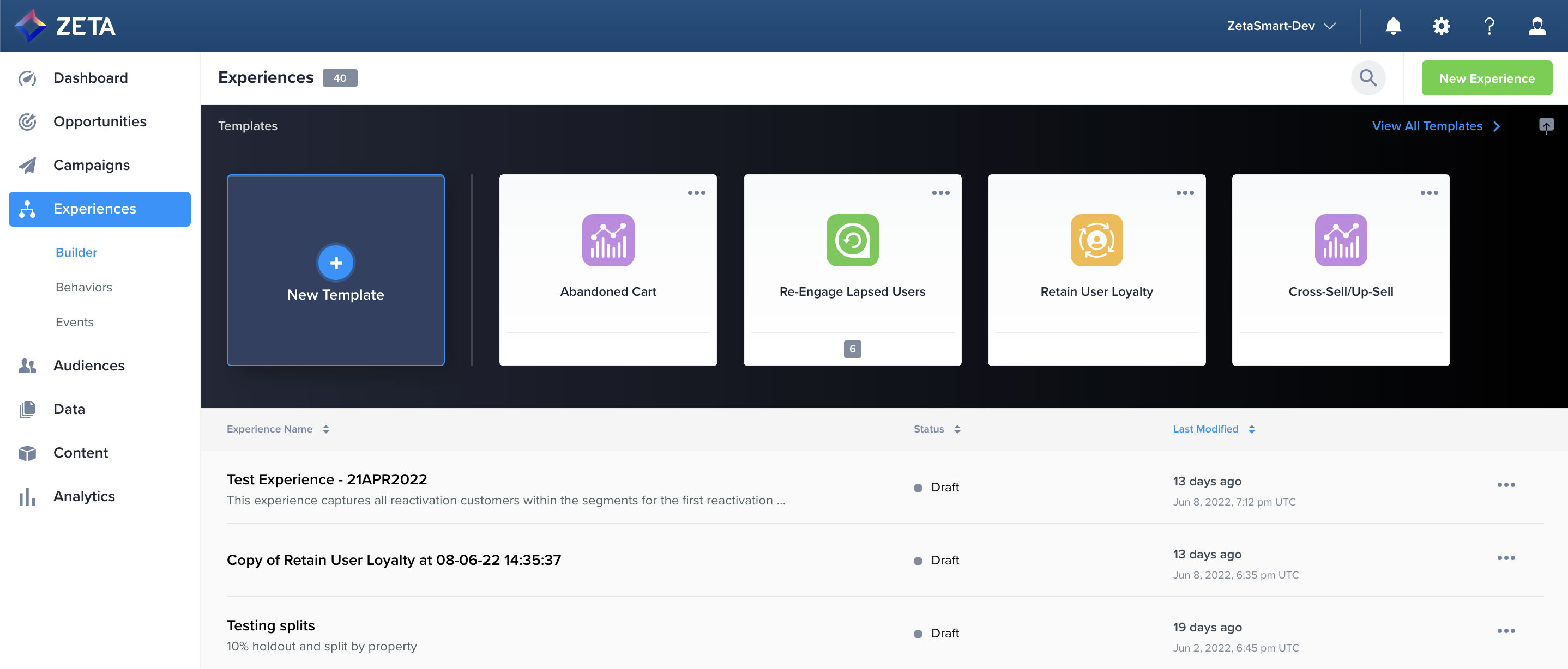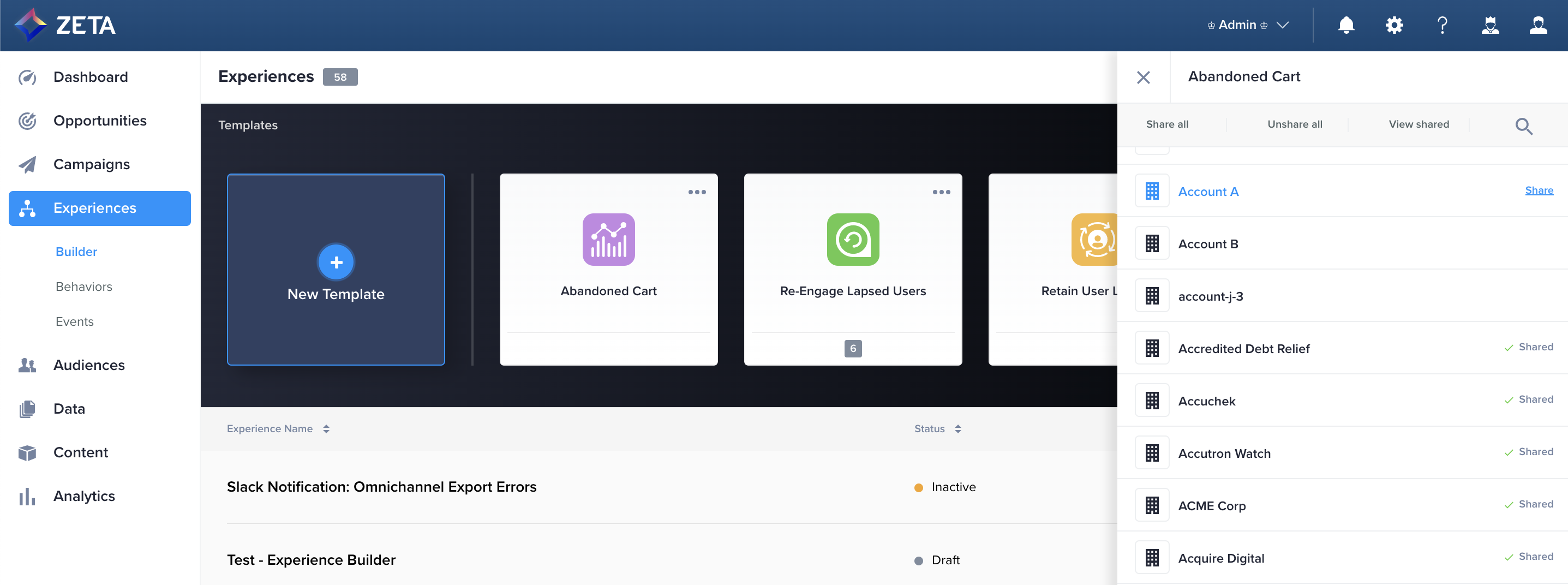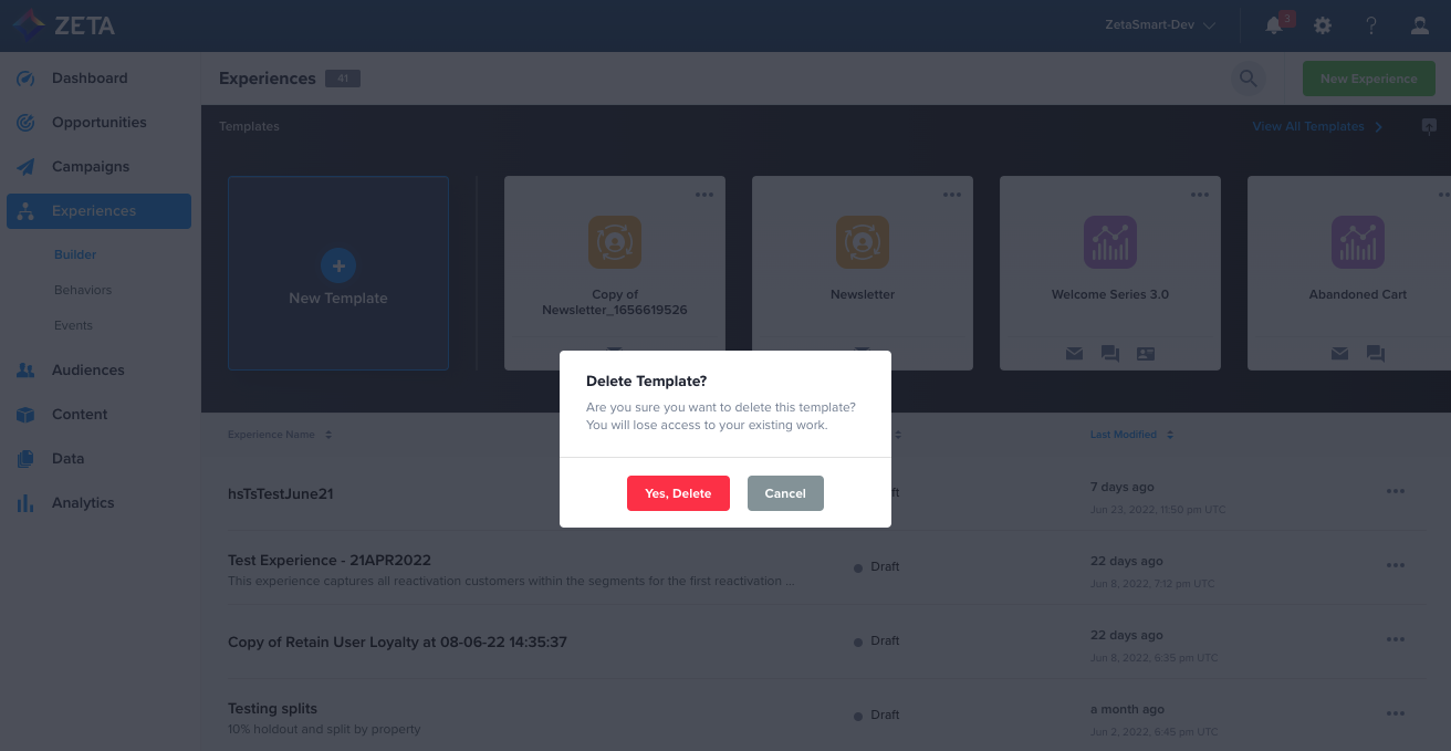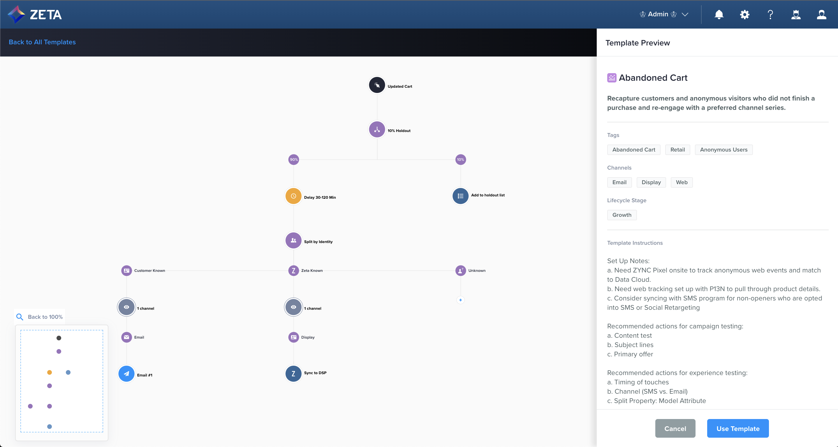 Zeta’s in-house marketing experts have created Experience Builder Templates to leverage best practices and the ZMP’s omnichannel capabilities to help users generate automation ideas and optimize setup time. For more advanced marketers in a Super User role, you can take advantage of this feature to provide templates for your teams and family of accounts, flexibly scaling your automation tactics across your business.