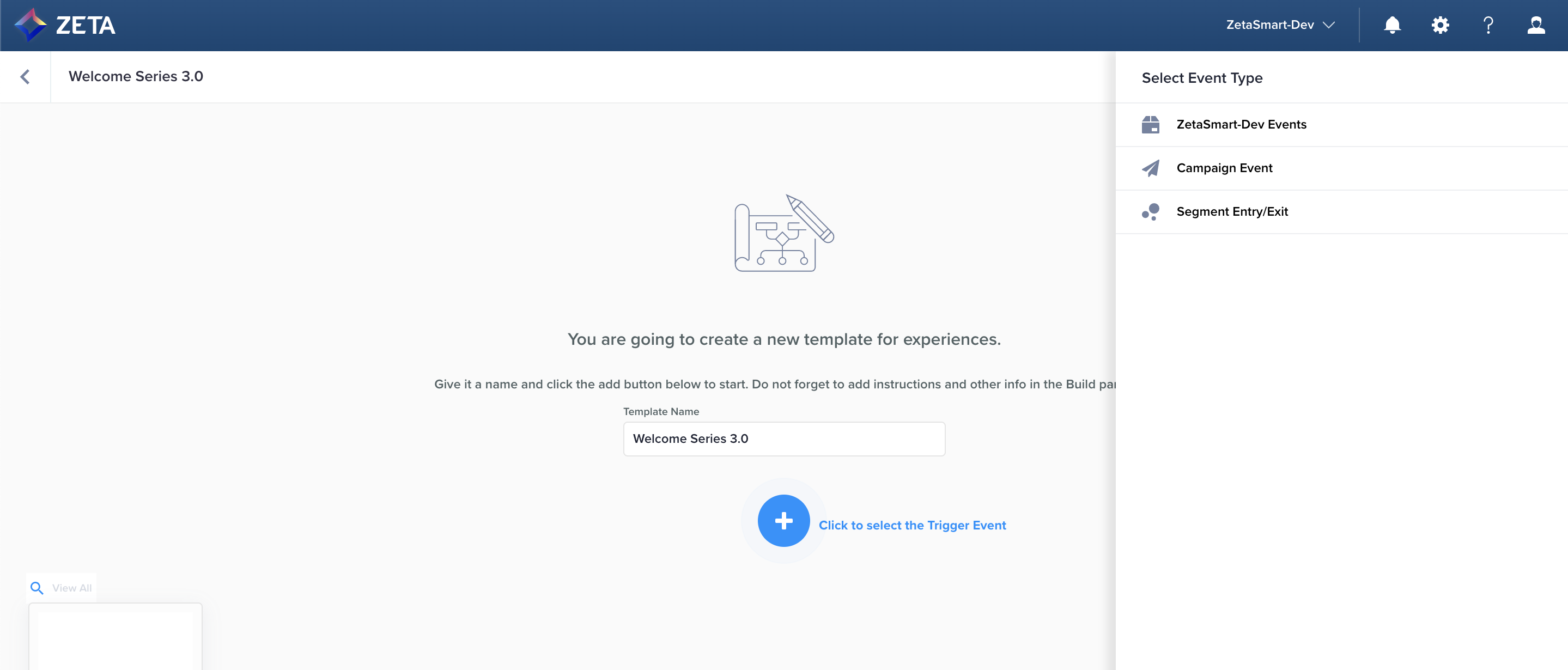 2. Upon adding to trigger event to the template, your template will officially be created. While you may see the Template Details panel open, you don’t necessarily need to fill this information out first. We’ll cover that in the next section. All changes to the canvas will be saved automatically so you don’t need to click a button to save your work (much like building a regular experience).