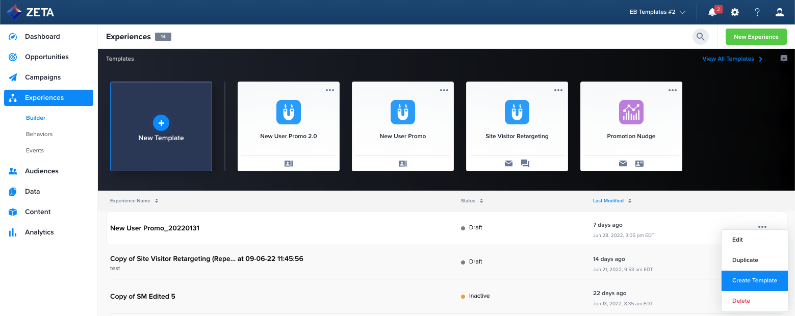 1. In the Experiences list, select the experience you want to convert. Click on Create Template from the menu.