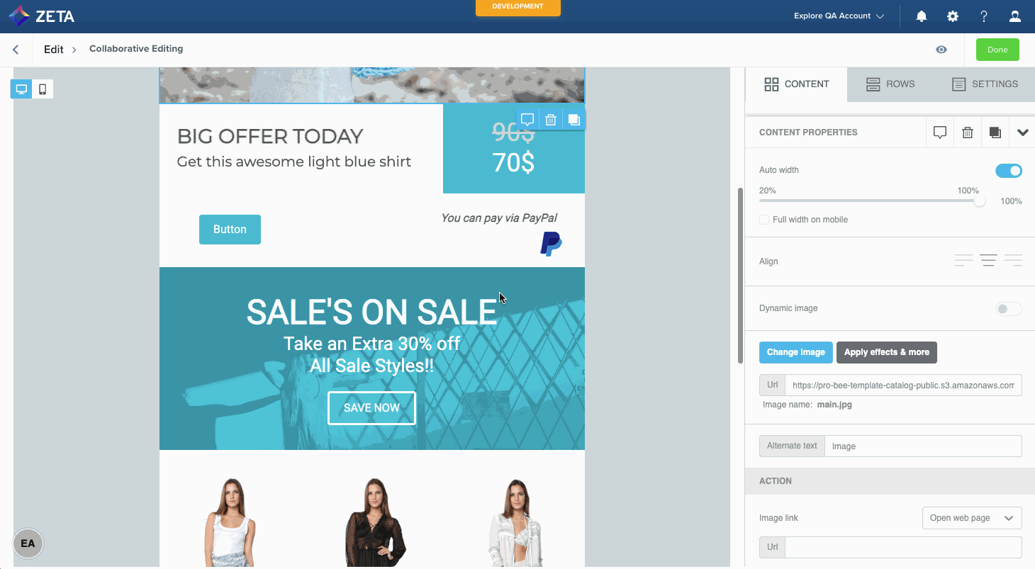 The visual editor supports collaborative editing with multiple users in real time. This feature is only available in Campaigns > Content & Audience and is not supported at the template level.