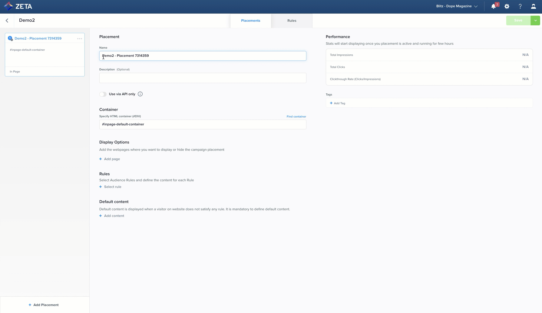 1. In the Placements tab, enter a Name and Description for your campaign.