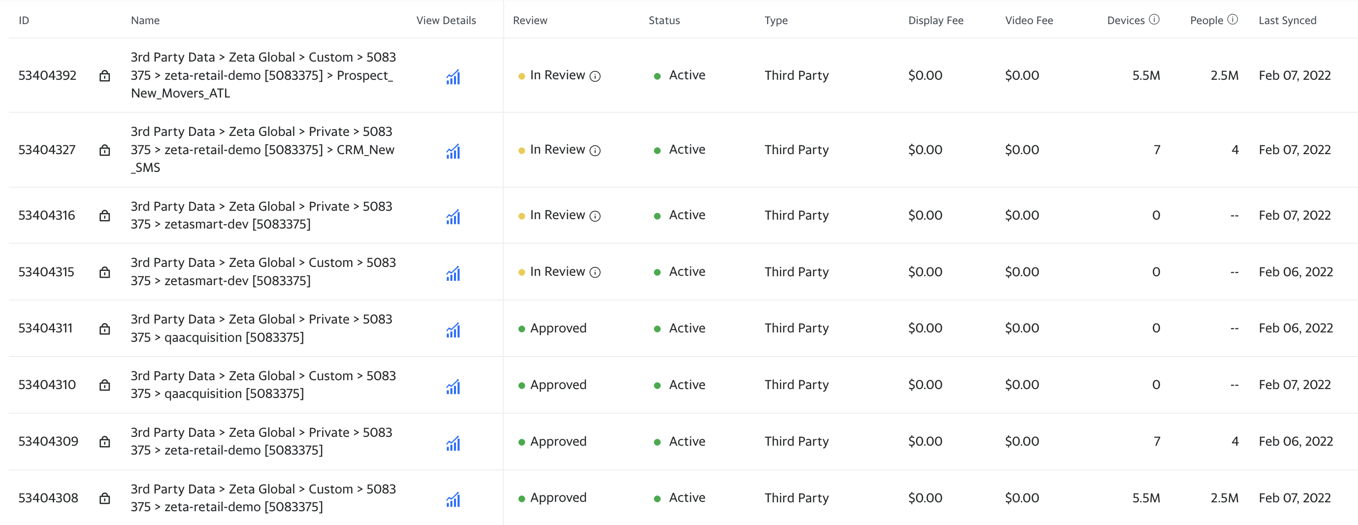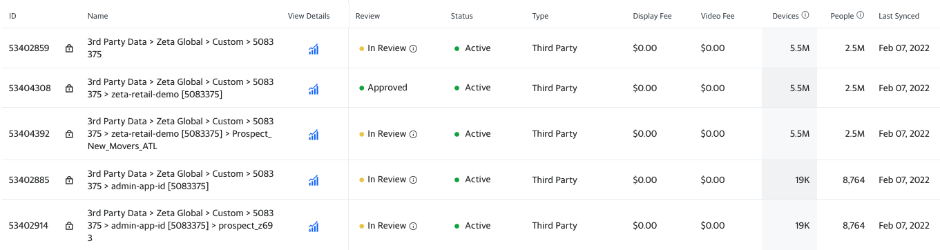 In this example below, the segment Prospect_New_Movers_ATL added 5.5M devices and 2.5M people to Yahoo DSP. This also added 5.5M devices and 2.5M people to the Site ID (zeta-retail-demo) and the MDM ID for the audience type (Custom > 5083375). Once more devices and people are added from other segments, the Site ID and MDM ID will continue to grow.