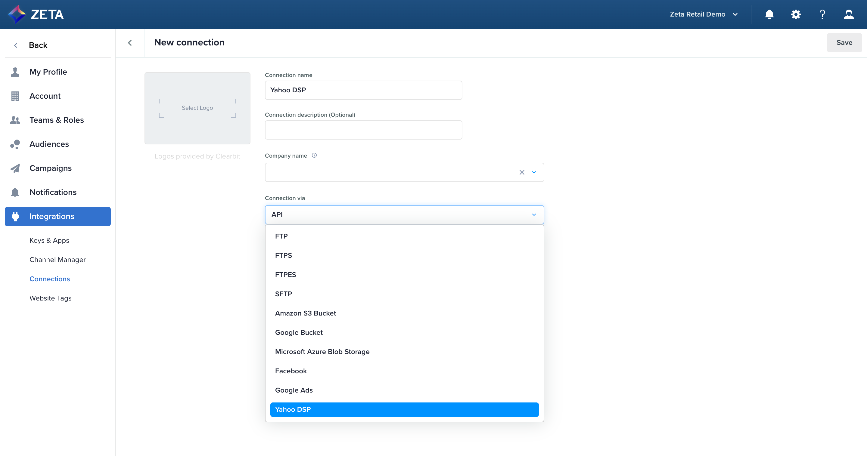 2. Select Yahoo DSP from the Connection via dropdown list.