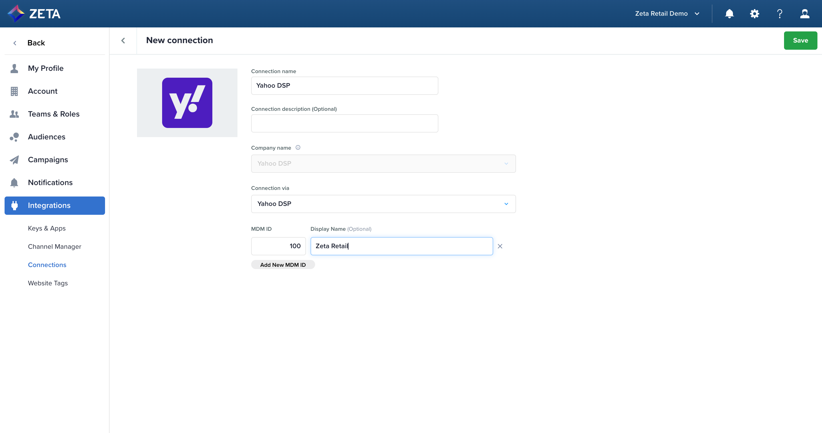 6. To add a new account to your existing Yahoo DSP Connection, simply add more MDM IDs and click Save.