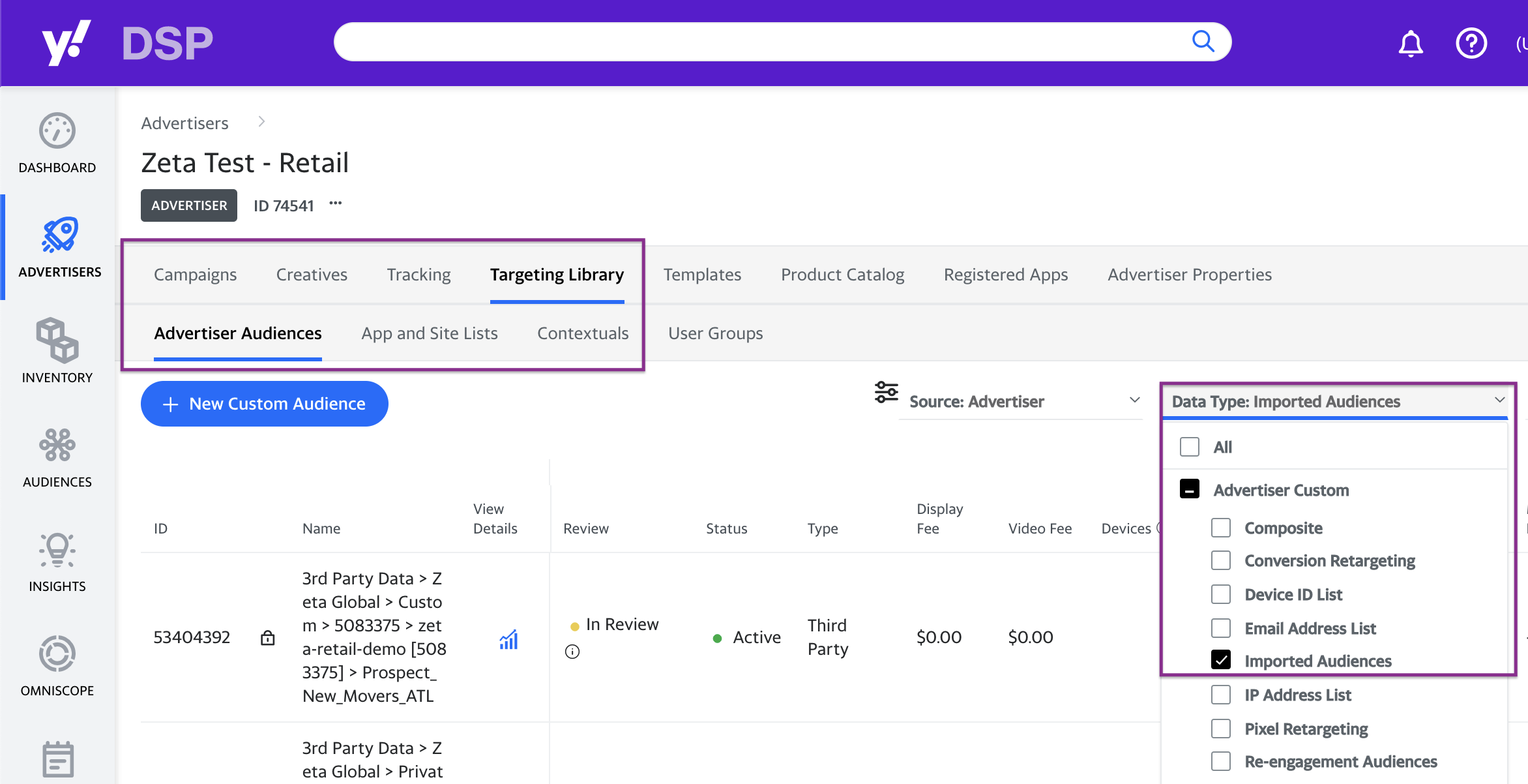 1. To find all audience data from the ZMP, navigate to Advertisers > Targeting Library > Advertiser Audiences.