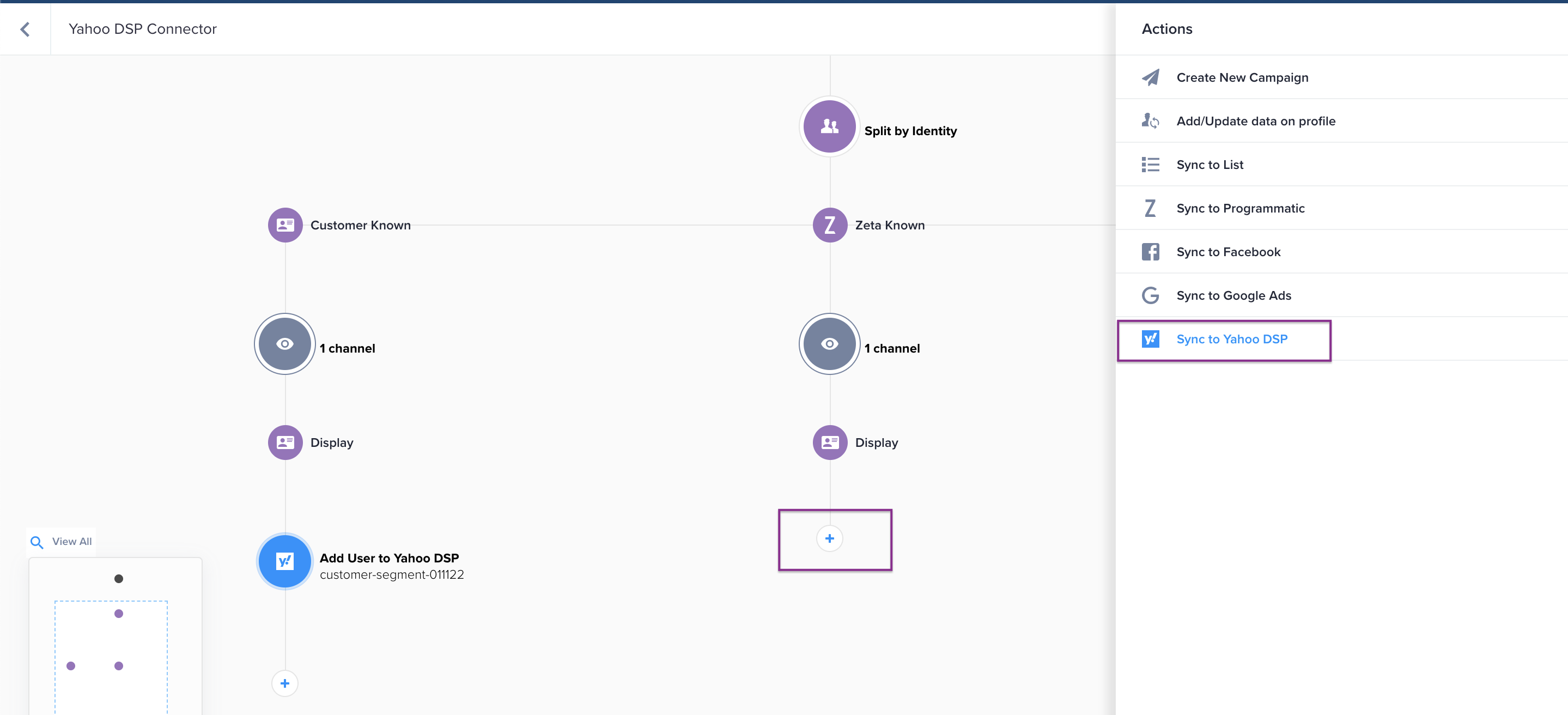 While you can add a Sync to Yahoo DSP node without using the Split by Identity feature, don’t forget to account for this when building your experience. You should select the Audience Type that best fits your use case in a given workflow.