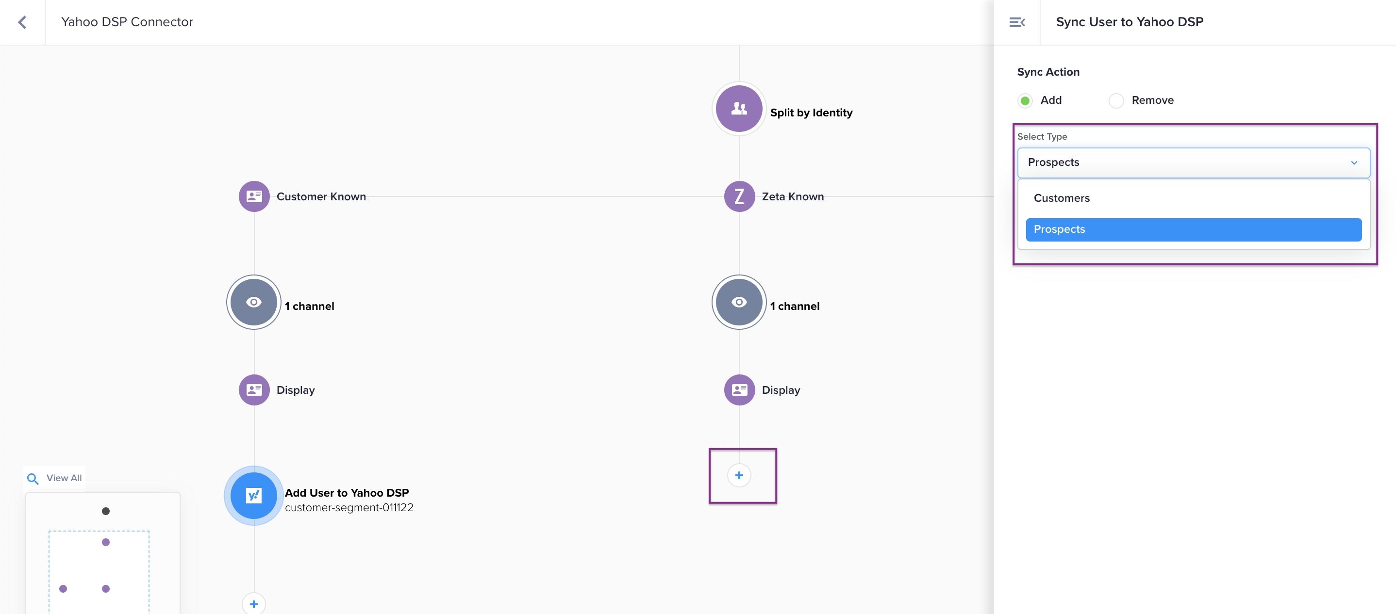 Because both Customers and Prospects can enter experiences, don’t forget to confirm what kind of segment you’re syncing to on the Yahoo DSP side for each node.