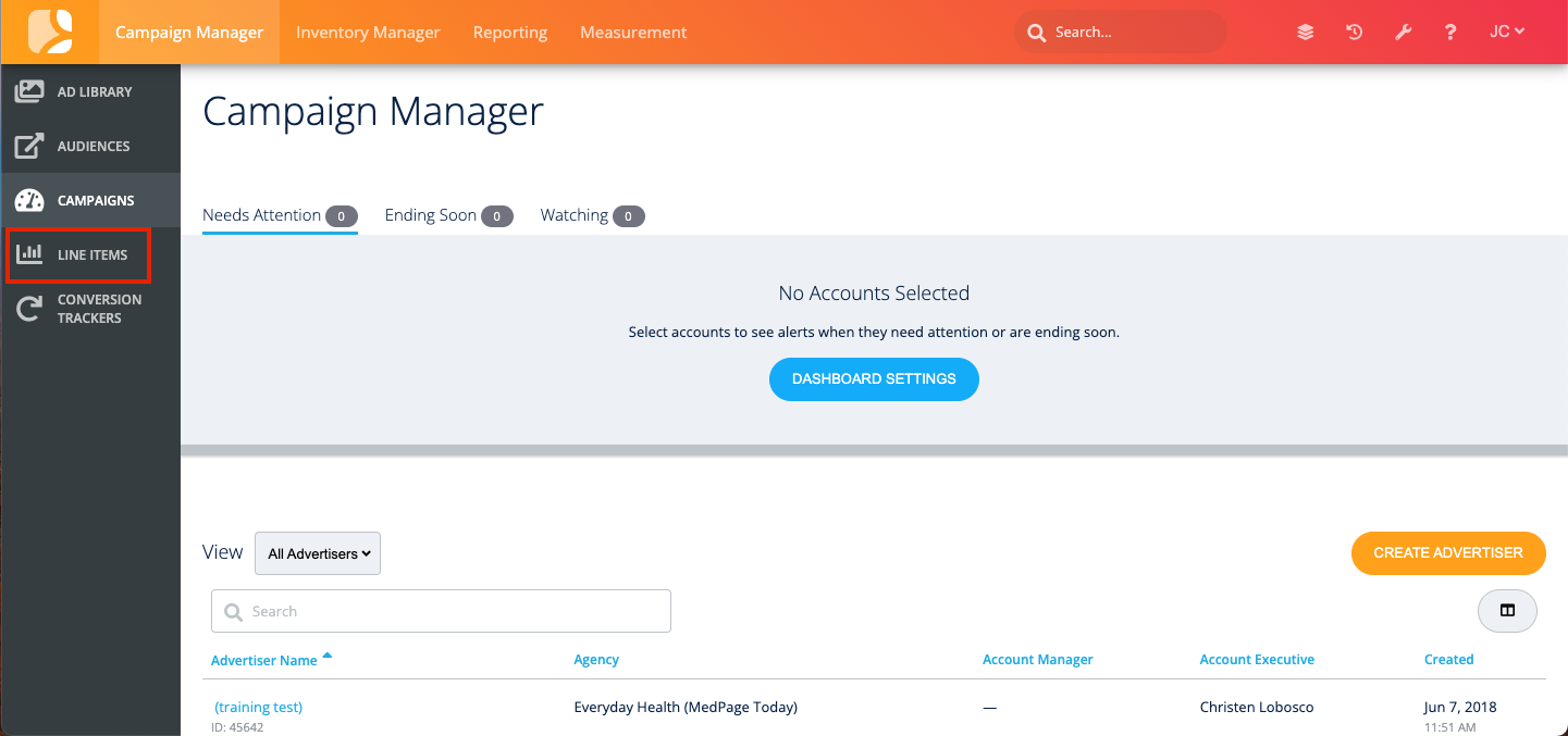 To start using the dashboard, go to ‘Campaign Manager’ in the LiveIntent platform. On the left-hand side menu, click the ‘Line Items’ option to navigate to the dashboard.