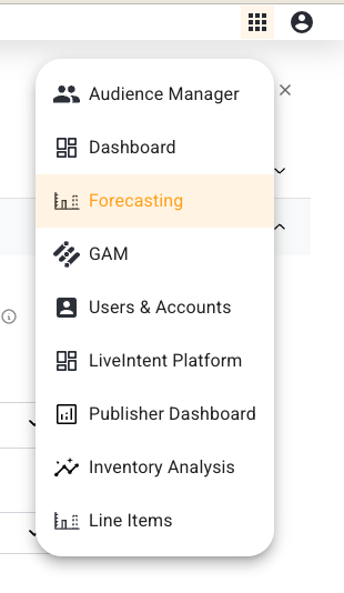 To start using the dashboard, please visit https://portal.liveintent.com and enter your login details. Once logged in, please navigate to the tool by clicking the navigation button in the top-right corner and select ‘Forecasting’.
