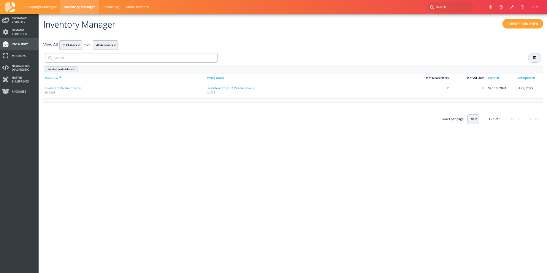 Inventory Manager is the section of the LiveIntent platform that allows you to manage and control your email newsletter inventory. Once you’ve logged in to the LiveIntent platform, you can navigate to Inventory Manager by clicking on the Inventory Manager option in the navigation bar at the top of the screen.