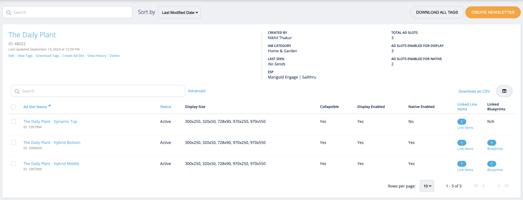 Active Ad Slots: This displays the number of active ad slots, their names, associated IDs, the sizes enabled, and the type of ad slot.