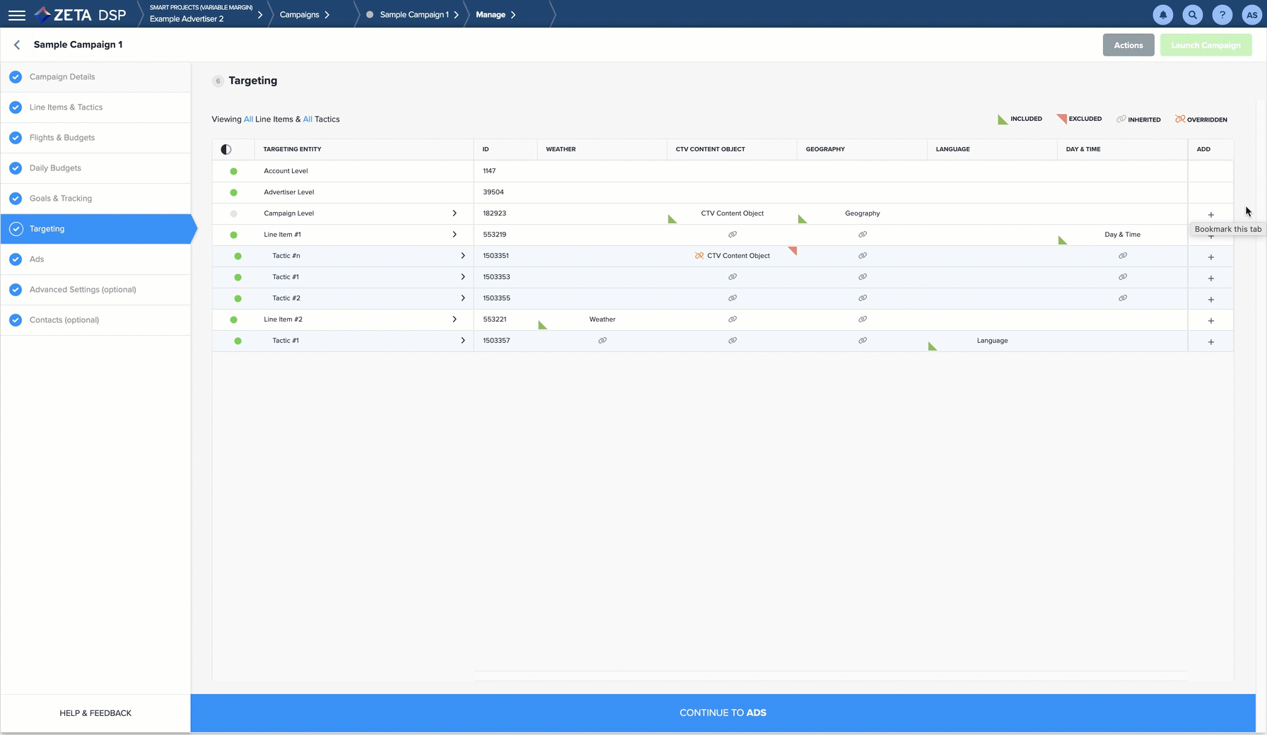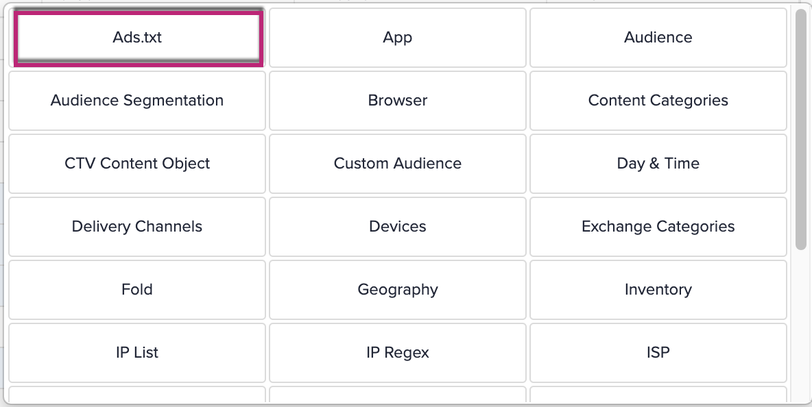 The Zeta DSP allows you to use Ads.txt targeting to ensure you are bidding on inventory authorized by a publisher. Use Ads.txt targeting to authorize only set classifications of SSPs (such as to include only direct and/or reseller-designated inventory).