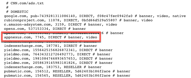 Ads.txt is an IAB-approved file that helps prevent unauthorized inventory sales. All participating sites have an ads.txt file in their top-level domain directory. This file lists the SSPs that are authorized to sell the site's inventory. These SSPs are identified as either Direct or Reseller.