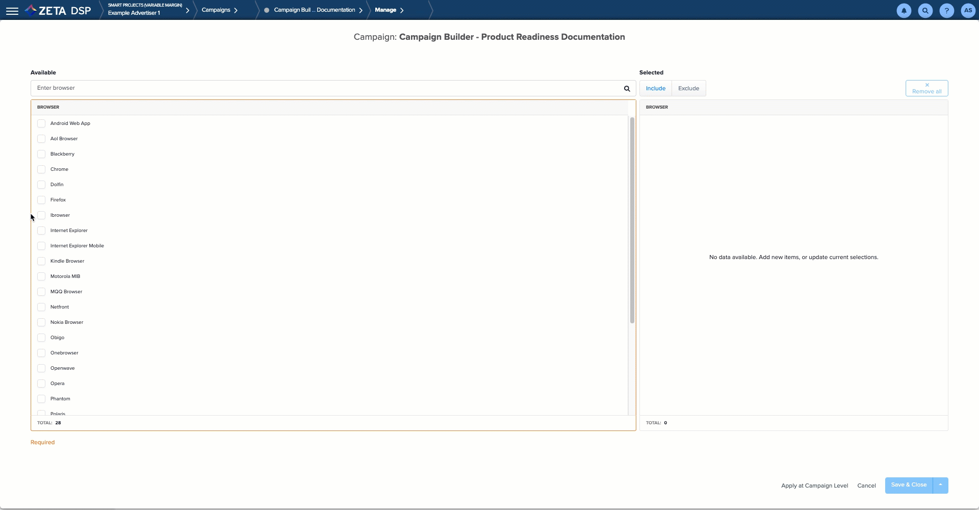 3. Within the Browser Targeting page, enable targeting of browsers by selecting Include. To exclude browsers, click on Exclude.