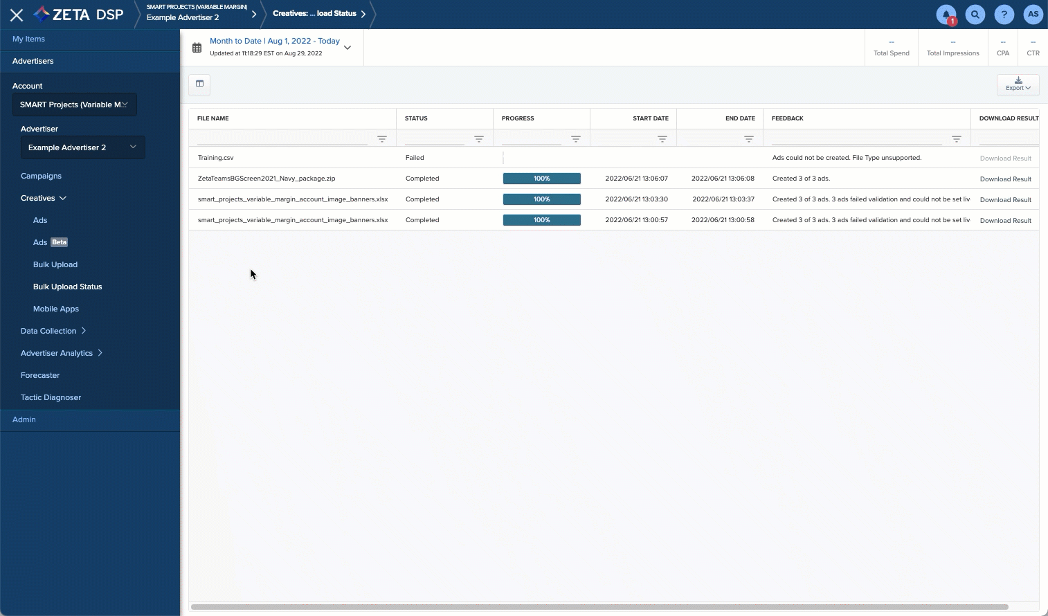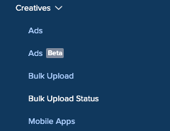 The Bulk Upload Status page needs to be refreshed in order to view the most up-to-date statuses. You can also access this page at any time to check on the status of any Bulk Upload by navigating to [Advertiser Name] > Creatives > Bulk Upload Status.