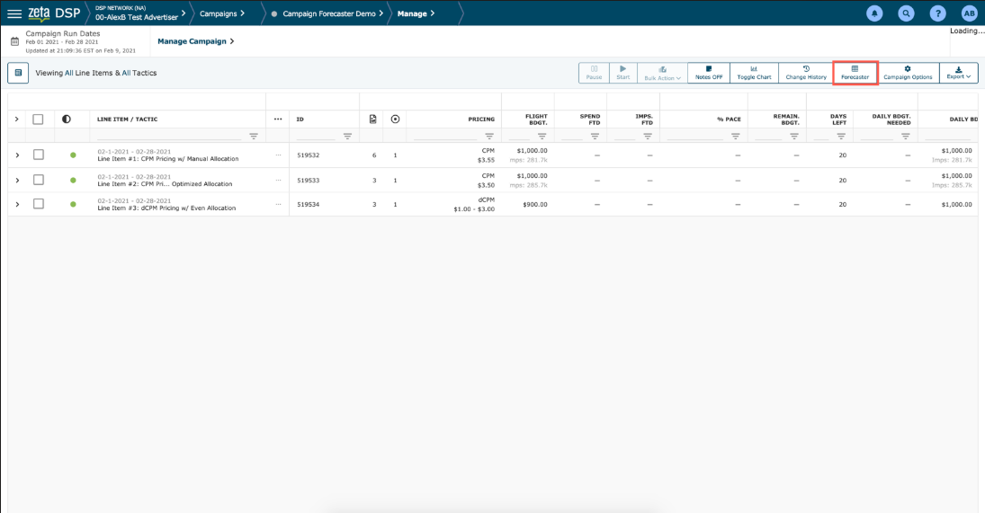 To Access the Campaign Forecaster from the Campaign Grid, click on the Forecaster button located in the upper right-hand menu bar as shown below.