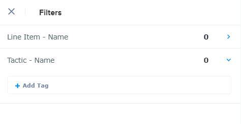 Filter | By clicking the Filter button, users can filter the data by Line Items and Tactics - As the Line Items/Tactics are selected the numbers will populate, user can also click clear and restart the selection. | |