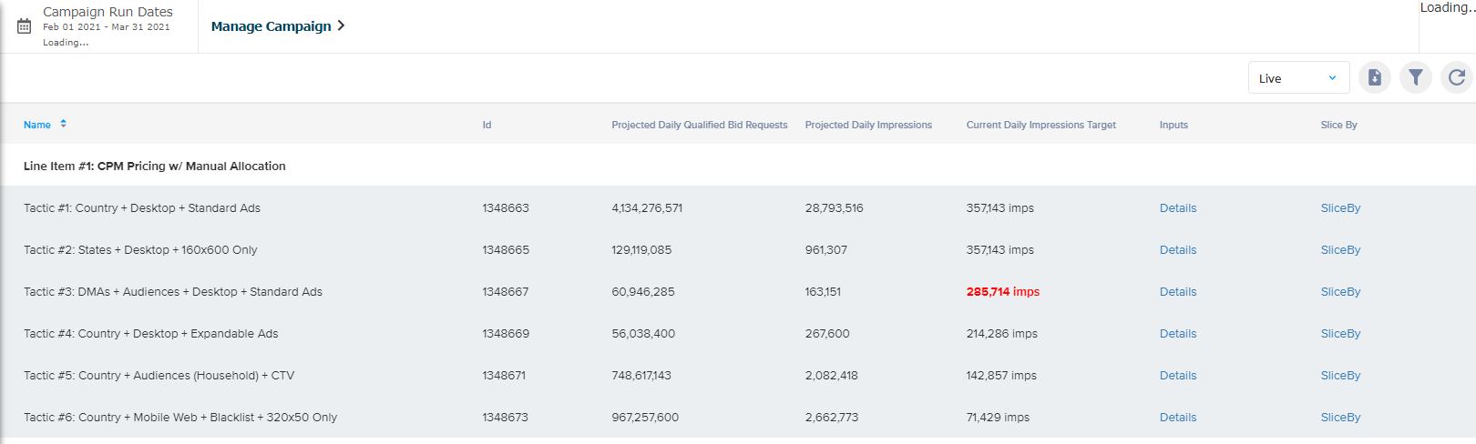 Projected Daily Impressions | Indicates the number of daily impressions available for a Tactic given its current targeting settings. |