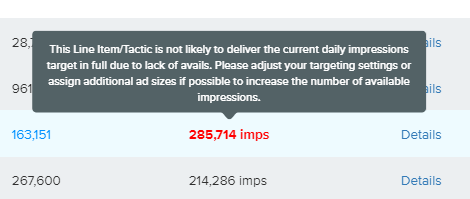 For Example, In the screenshot above the “Current Daily Impressions Target” column - amount 285,714 is highlighted in red with the following notification upon hover: