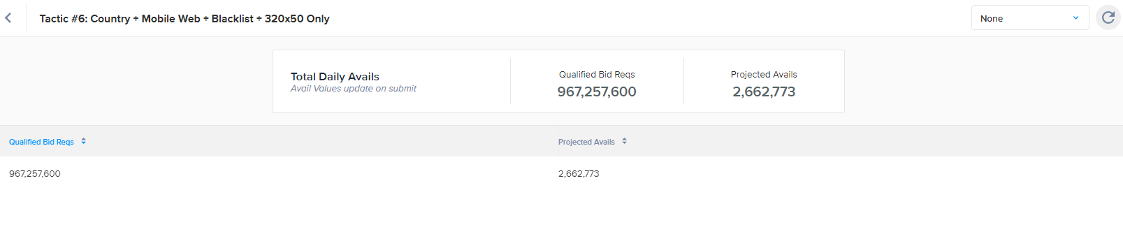 Projected Daily Qualified Bid Requests | Indicates the number of daily qualified bid requests available for a Tactic given its current targeting settings. |