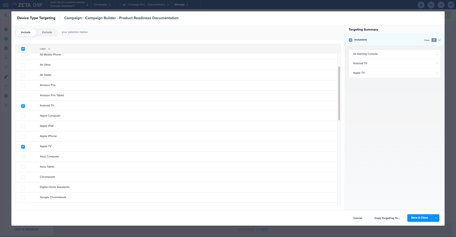 The Device Targeting feature allows you to either target a set of devices (i.e., Android, iPhone, Computer) or exclude a set of devices, but not to target some and exclude others. In effect, targeting certain devices means the AI is less likely to present Ads on the others. Conversely, excluding a set of devices means that only the other device types will see Ads.