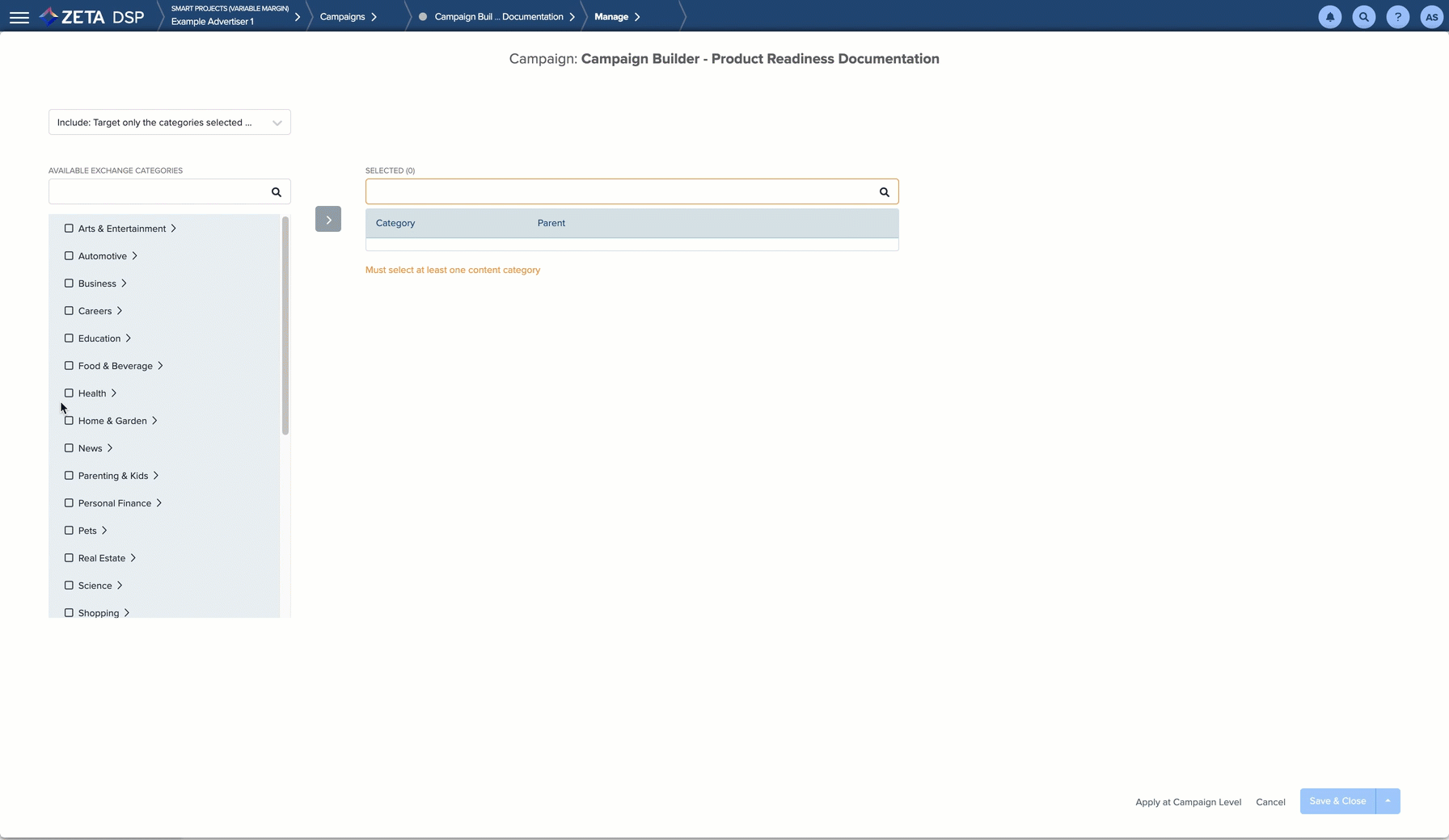 4. Upon selecting the Exchange Categories you wish to target on RFI (Zeta), ADX, or APN (AppNexus), click on the [>] to add them to the column on the right.