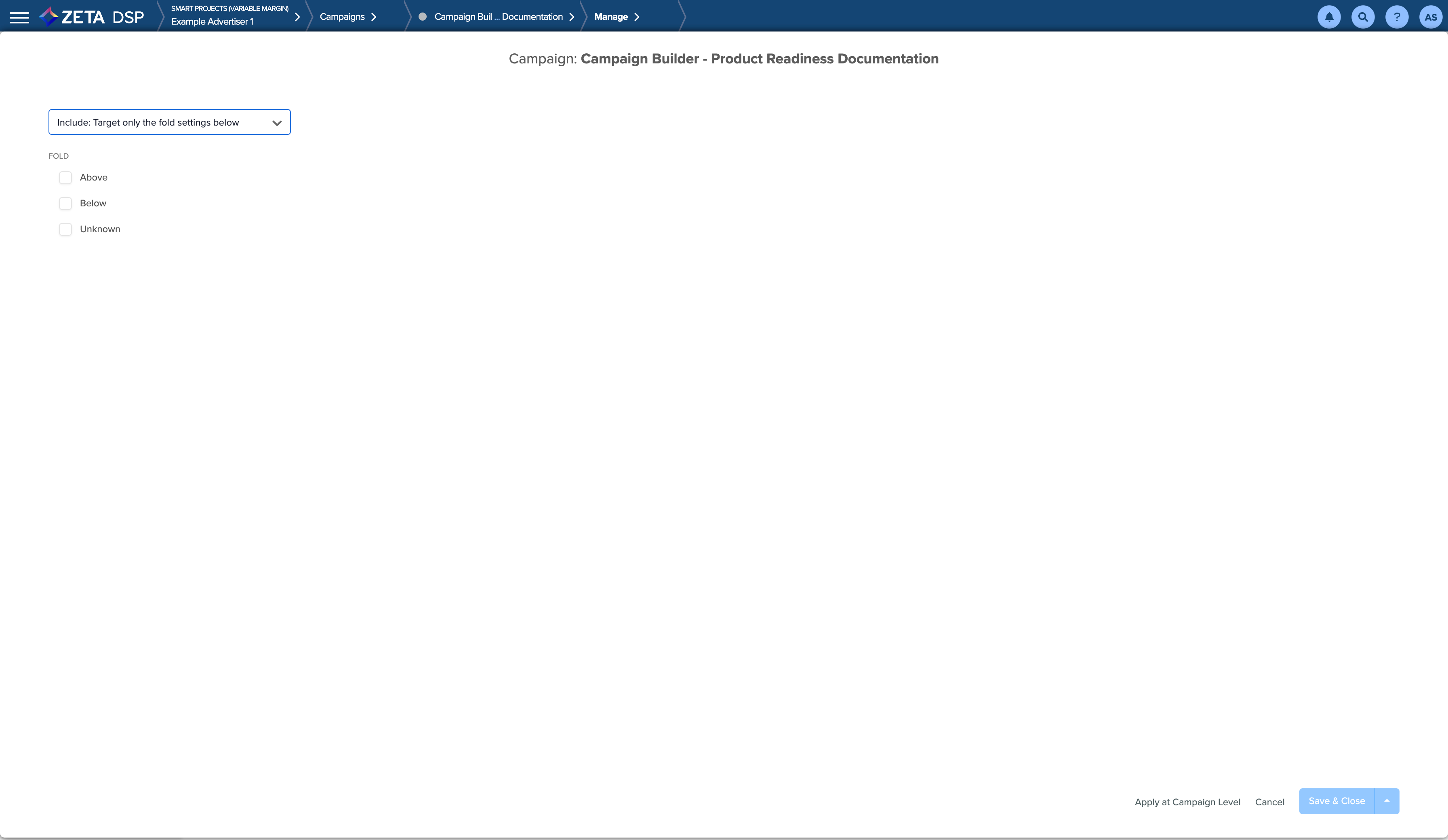 Depending on the Exchange, there may be cases where the Ad position is not reported to Zeta; these cases are classified as Unknown. Checking the Unknown box permits the DSP AI to utilize these placements and helps in finding enough opportunities to display the campaign's Ads.