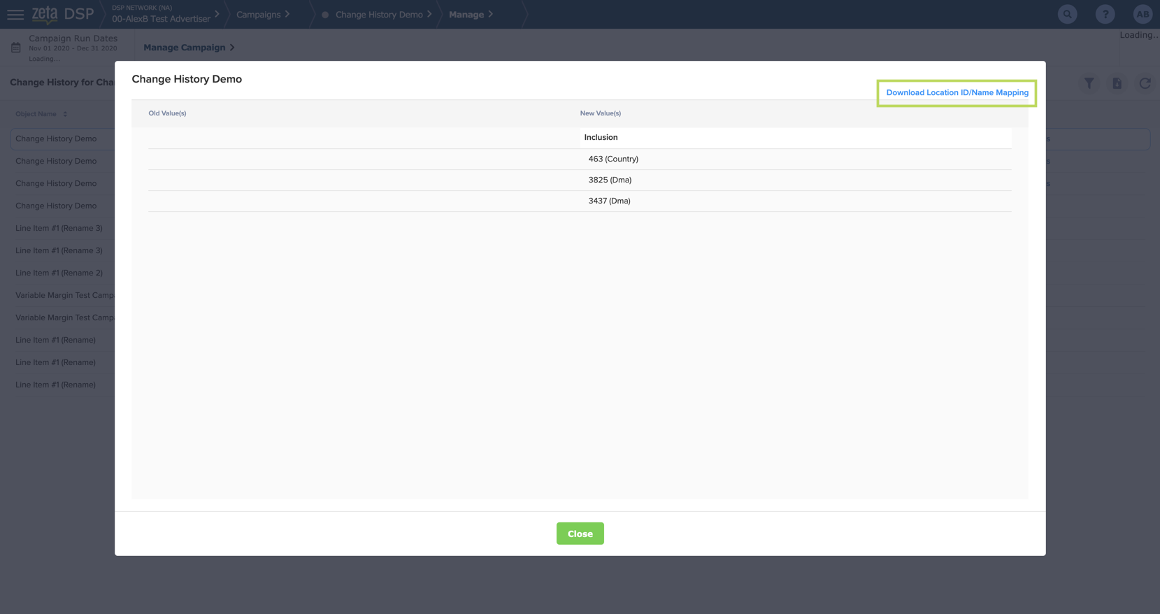 Location | Captures changes to Location Targeting made at the Line Item level. The Change History table will indicate the total number of locations included or excluded, while the Show Details view will provide the full list of locations. Only the IDs for Countries, States, Cities, and DMAs are displayed currently, but a mapping of IDs/Names can be downloaded by clicking the Download Location ID/Name Mapping link at the top-right corner of the pop-up. ![]() |