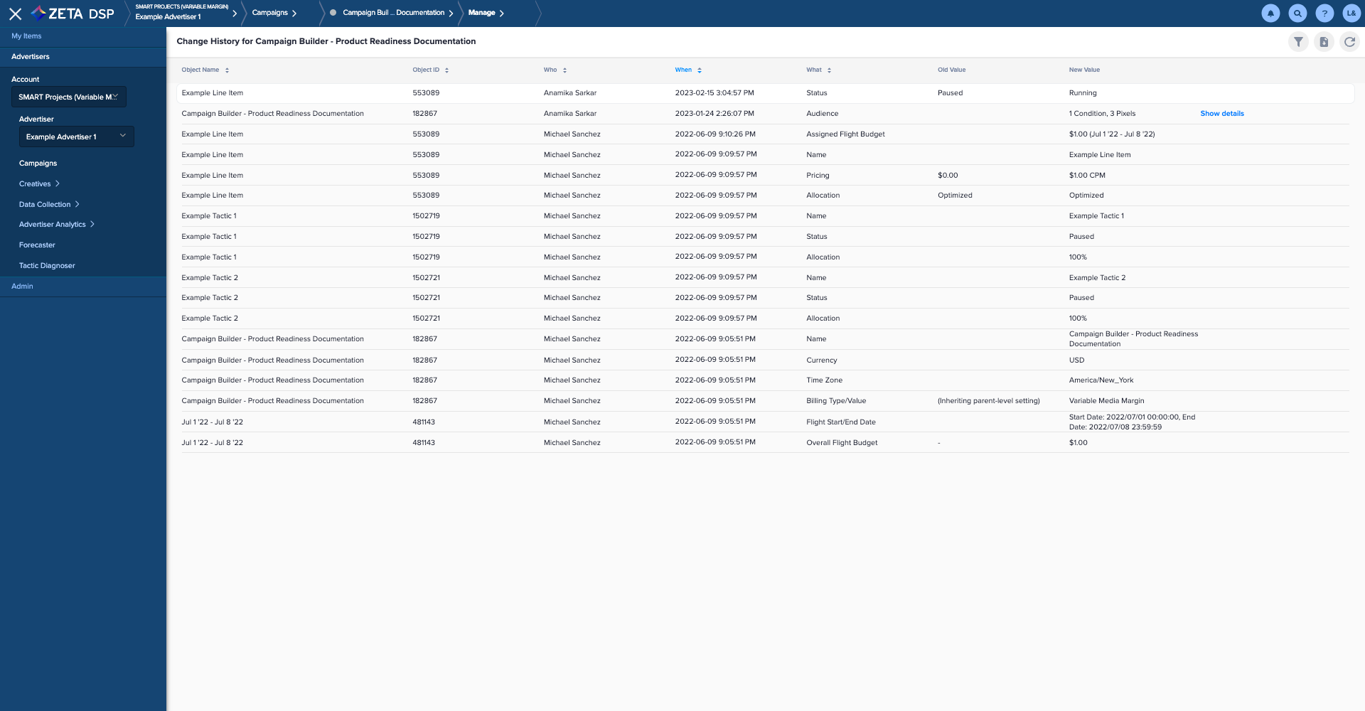 Overall Flight Budget | Captures changes made to the Overall Flight Budget that can be made in either the “Campaign Details” or “Flights & Budgets” steps of the Campaign Builder. |