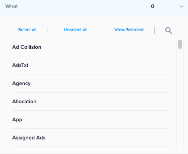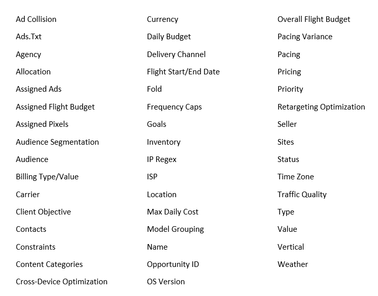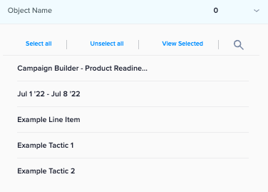 What: From the settings that are applied to your Campaign, Line Items, and Tactics, you can select or Deselect based on what you’re trying to sort.