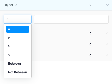 Object ID: Type in the numerical value; additional sorting can be added in by selecting from the dropdown (=, Not equal to, >, <, Between, Not Between).
