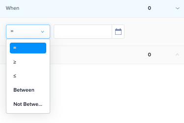 When: Select Date by clicking on the calendar account; additional sorting can be added in by selecting from the dropdown (=, Not equal to, >, <, Between, Not Between).