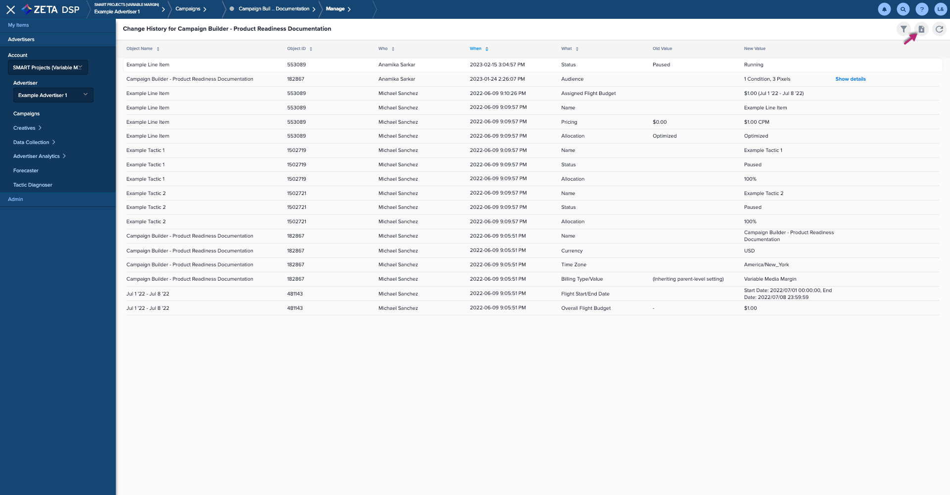 If you keep the Change History UI open through the day and make changes to any campaigns, line items, or tactics; be sure to click on the Refresh button to get details on the most up to date changes