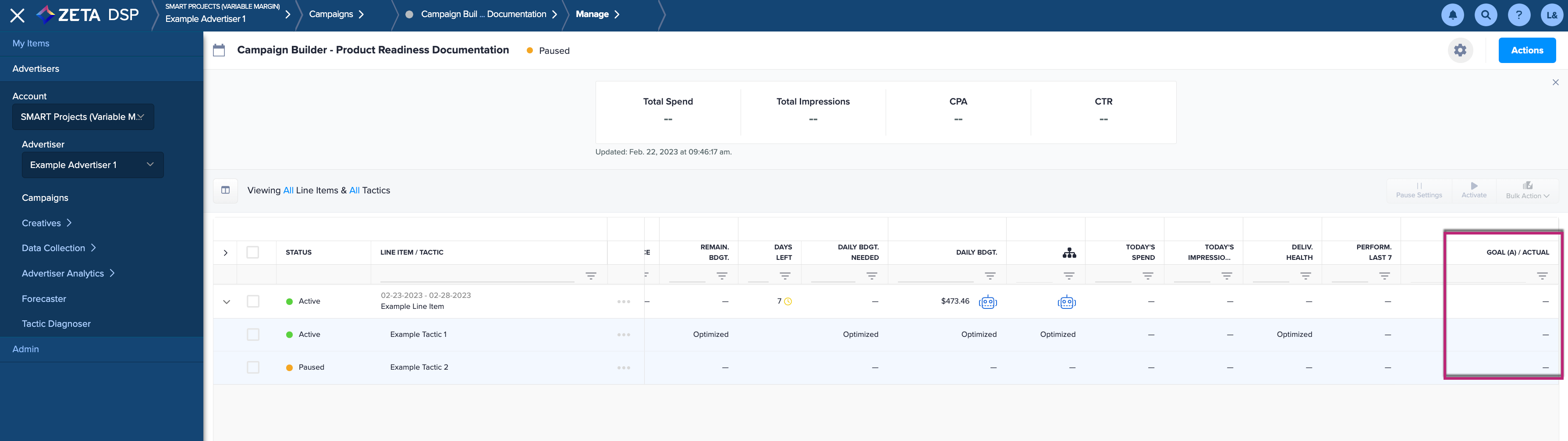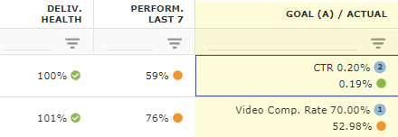 If one goal is in place on a line item or tactic, the percentage shown is the actual performance compared to the goal. (e.g., the campaign has a single CPA goal of $1, but the CPA over the last 7 days is $5, the column shows 500%)