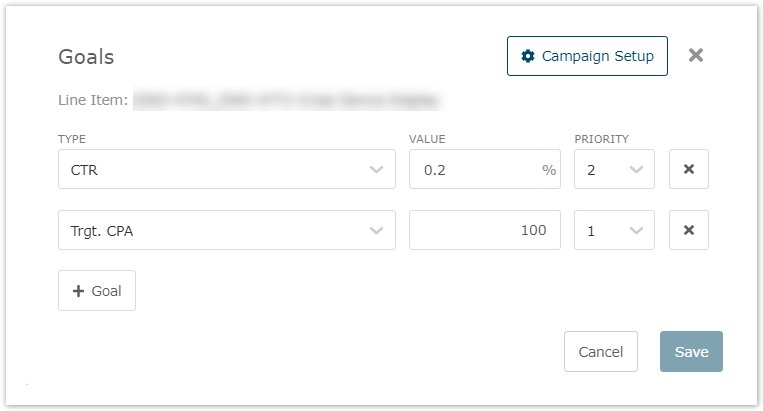 Click on the Goals column to view details. In the Goals pop-up, you can adjust the goal, priority, and value for all line items/tactics that have not yet begun delivering.