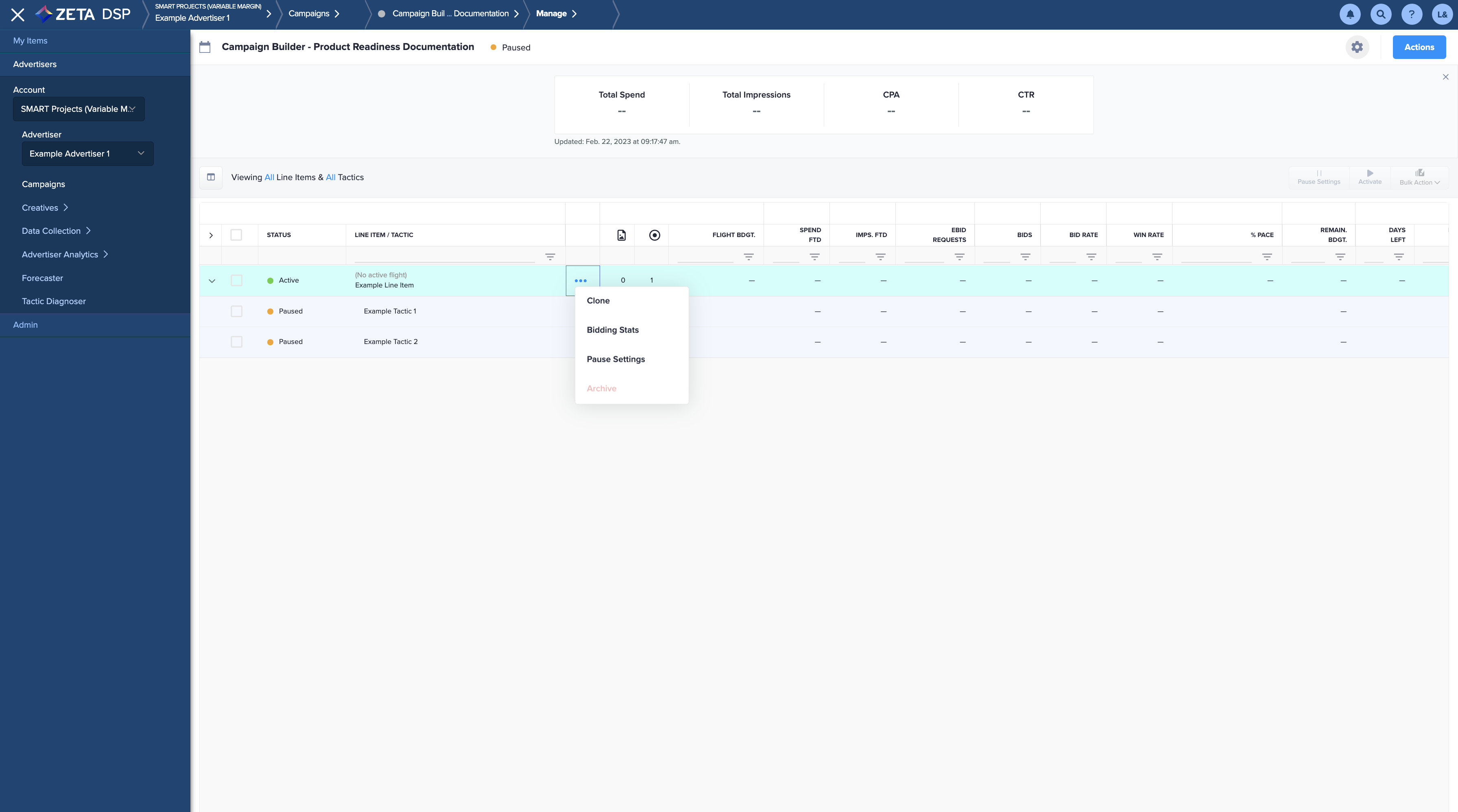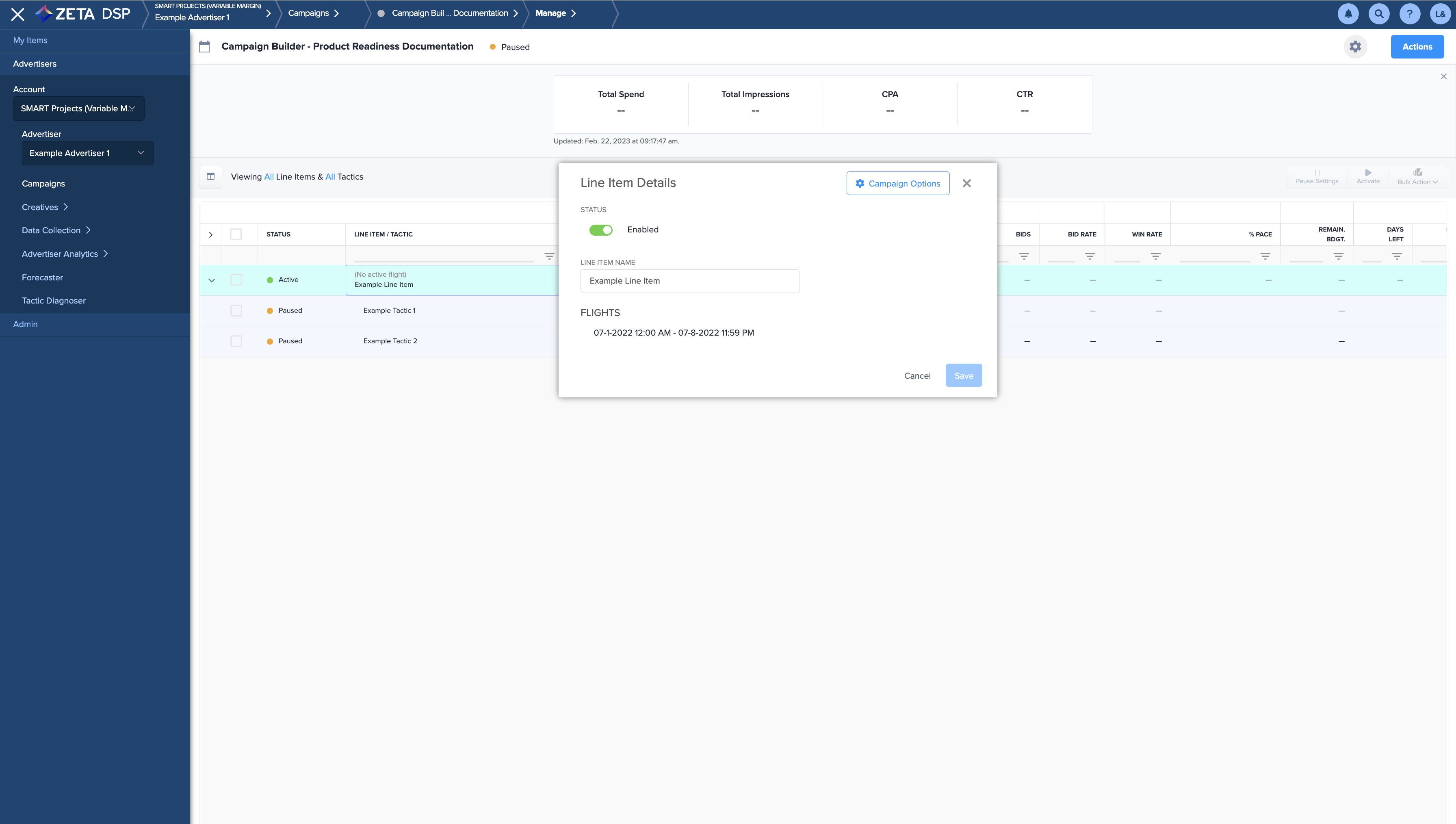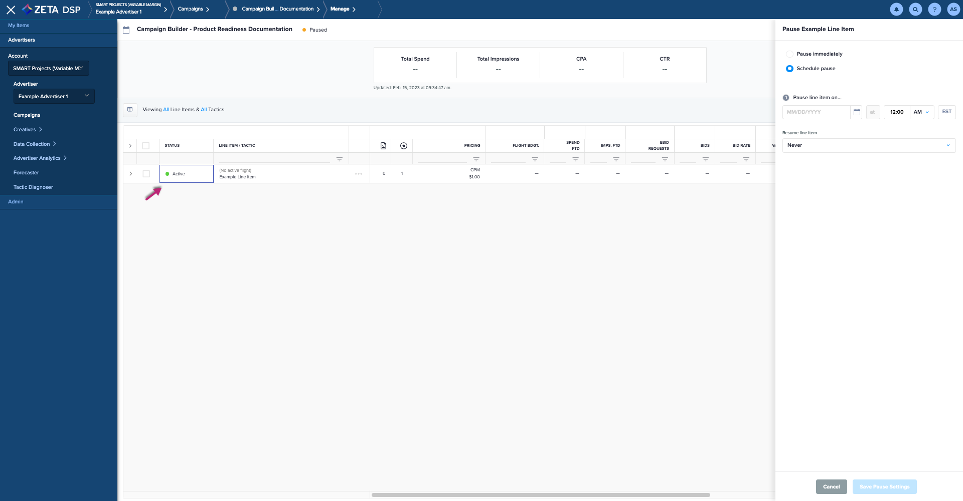 Pause or start a line item or tactic by hovering over its Status icon and clicking on the toggle.