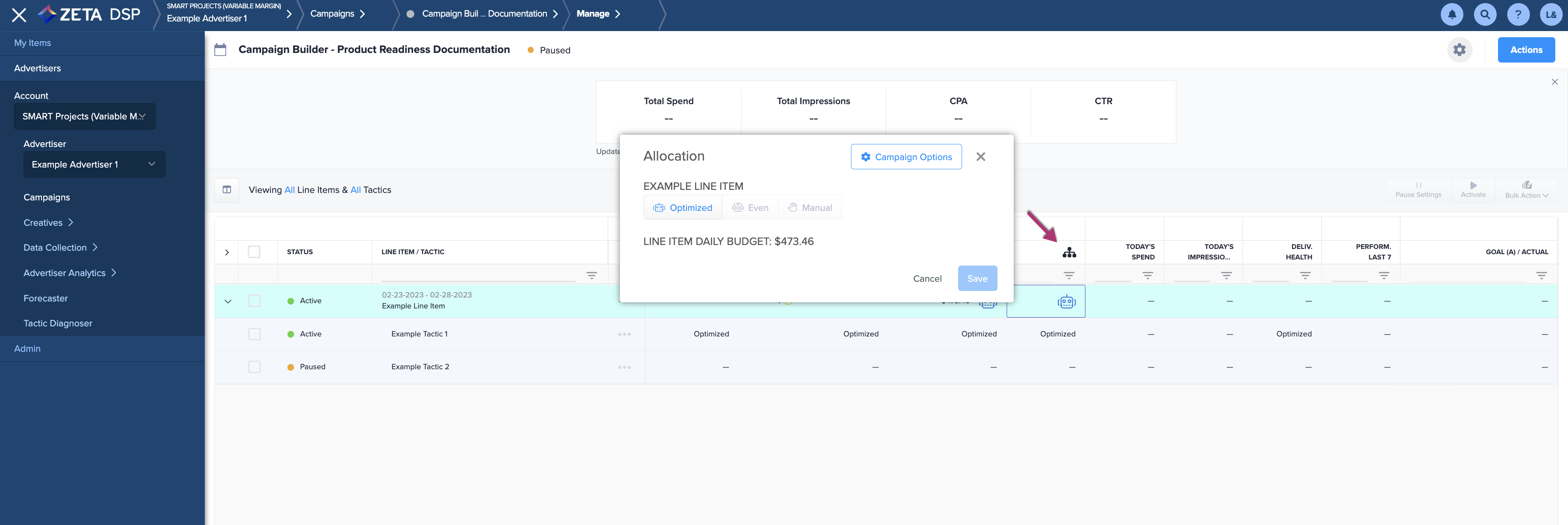 The Allocation column shows a flowchart icon in the header. While tactics are allocated among line items, this column shows the icon corresponding to the tactic allocation method for the line item.
