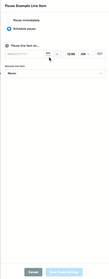 To specify a resume date/time, select On in the Resume line item dropdown and select the appropriate date and time. To keep the campaign paused indefinitely, select Never in the same droplist.