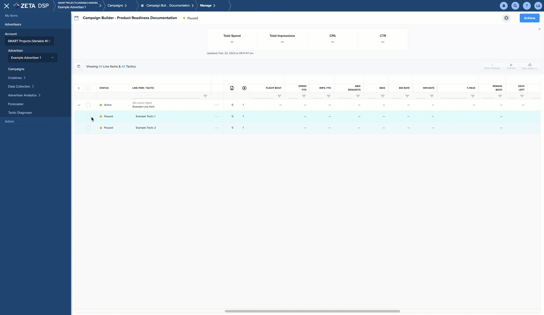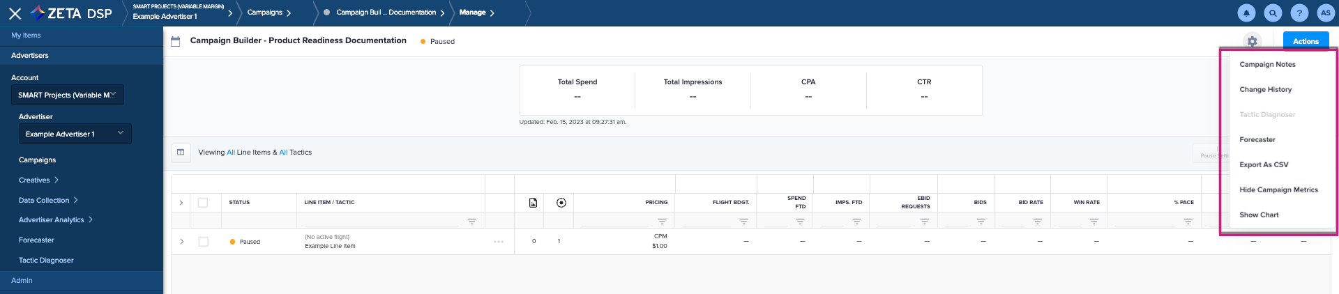Click on the Actions button to view Campaign Notes, Change History, Tactic Diagnoser, Forecaster, Export As CSV, Show/Hide Campaign Metrics, or Show Chart.