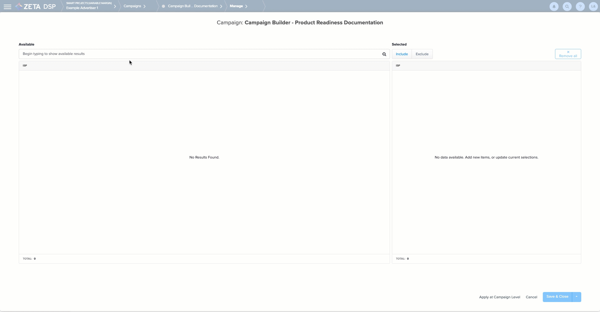 3. Enter the ISP name into the search box under Available (ISPs). The DSP will display several matching ISPs. To enable targeting of particular ISPs, click on Include. To exclude specific ISPs, select Exclude.
