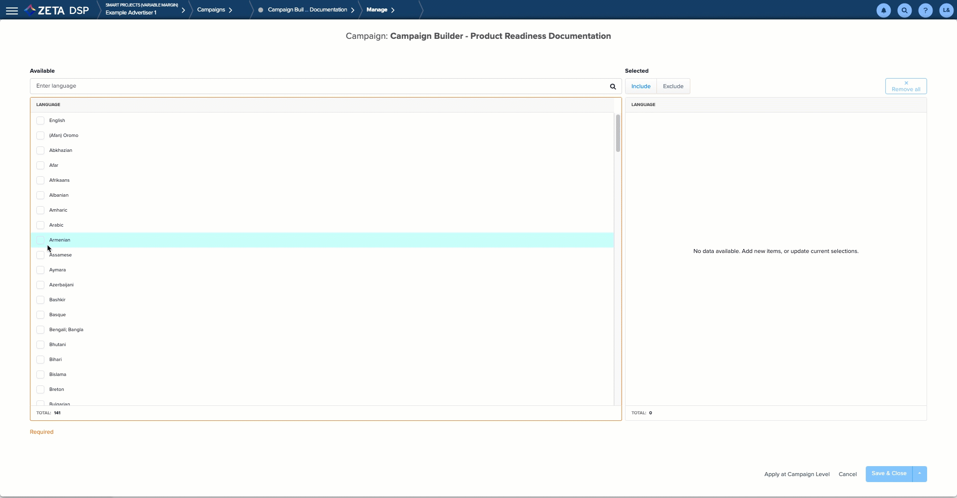 3. Select Include or Exclude and then the desired language you wish to target from the list.