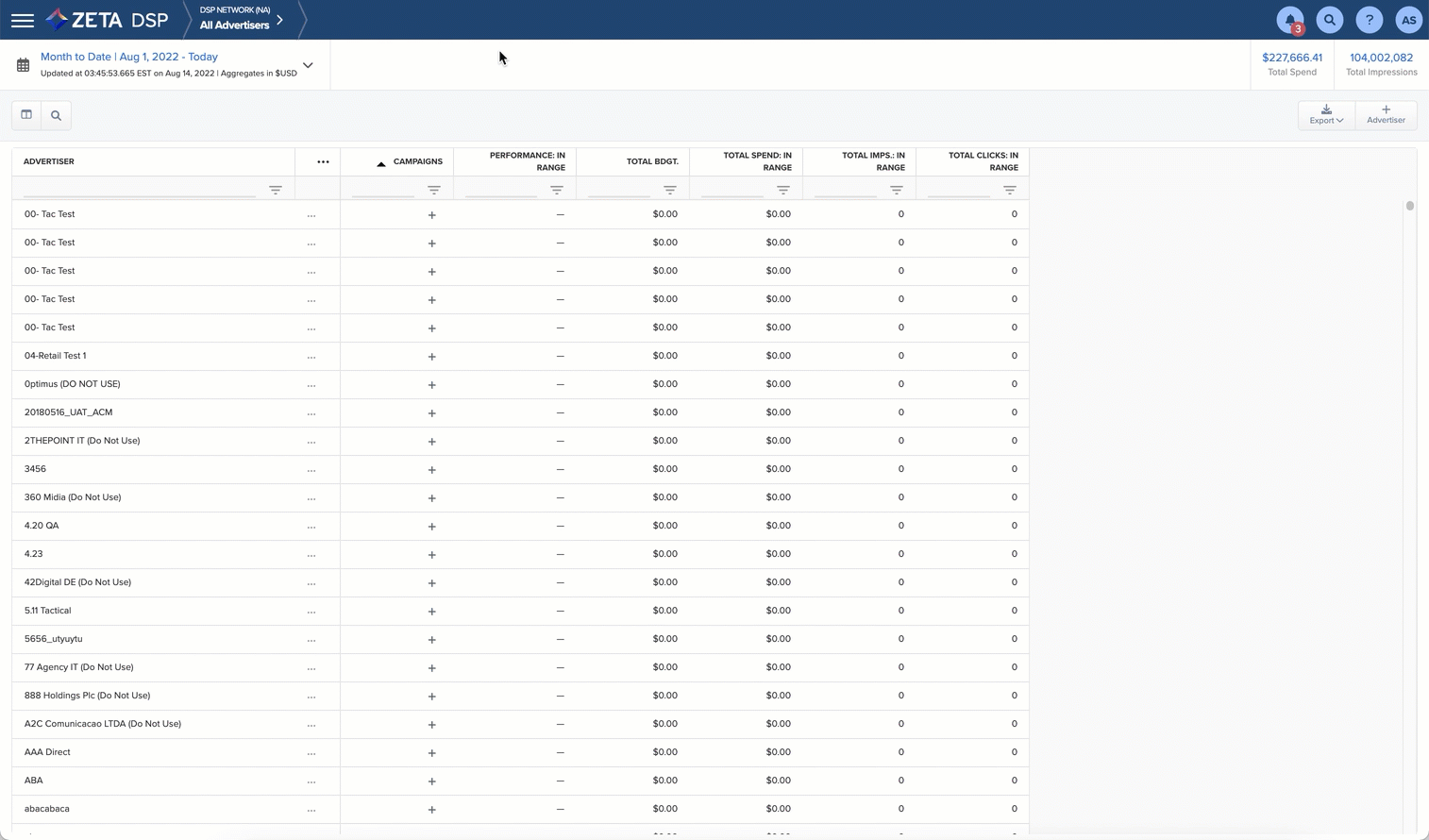 1. Click on the DSP logo in the upper left corner. Within the menu that appears for Advertisers and Admin, select the Account that contains your advertiser, and then select your Advertiser.