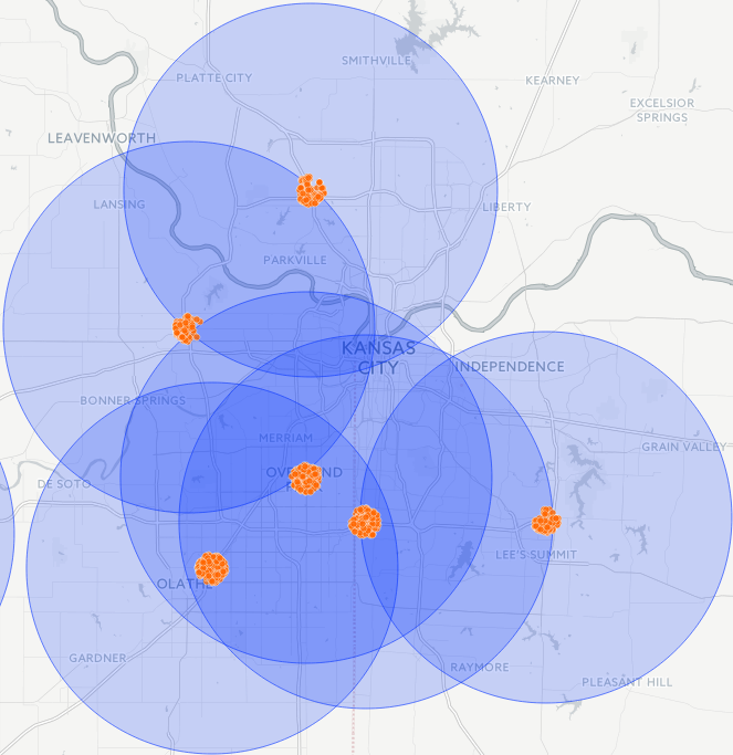 Bubble | This view displays Ad events as larger, orange circles. This view is better suited for studying a large area. |