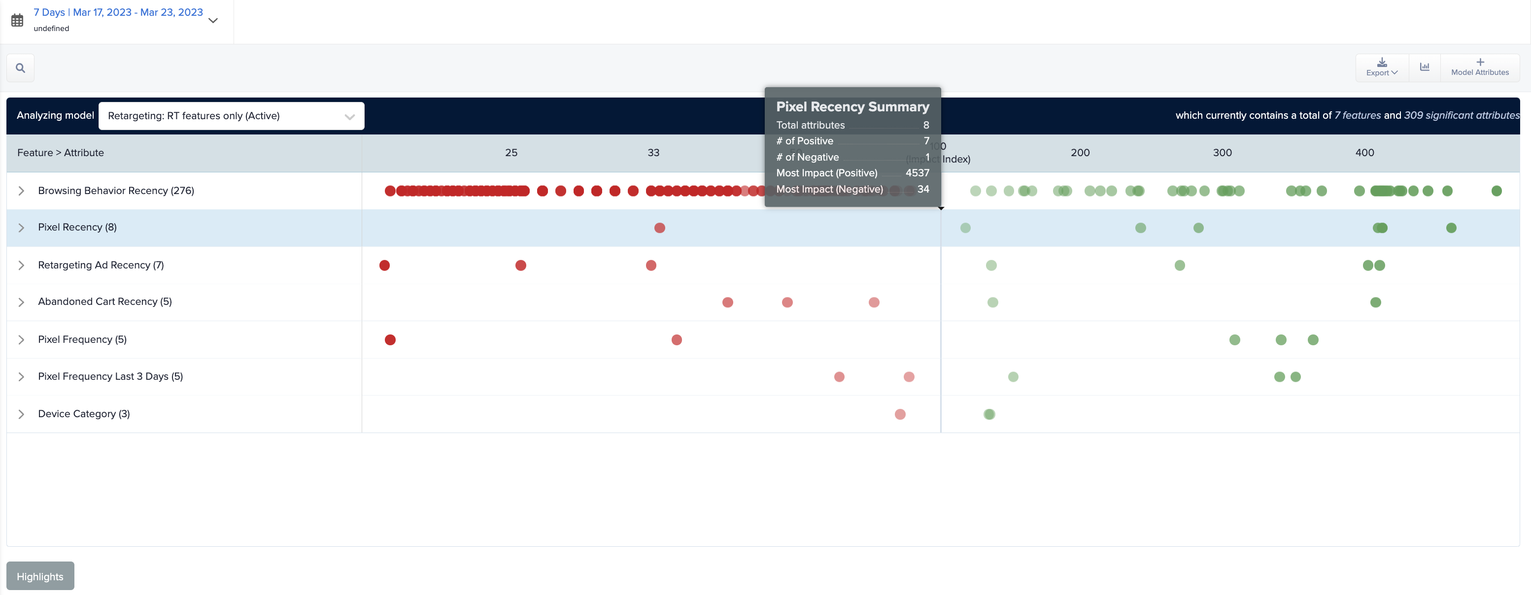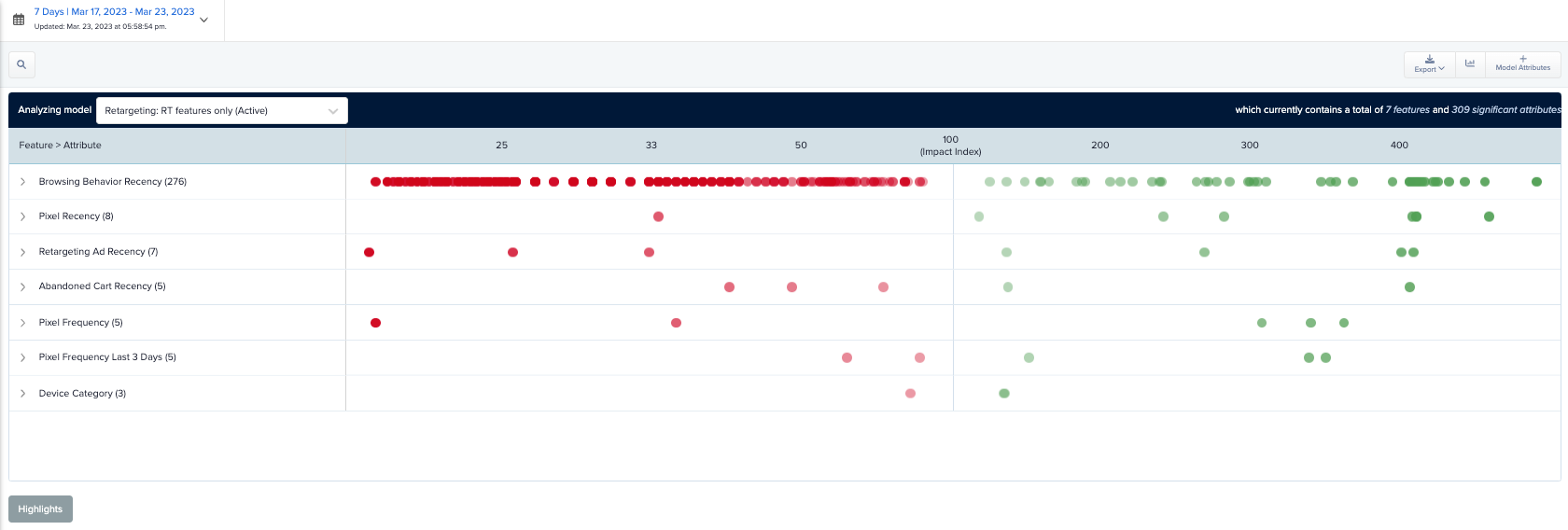 Each individual attribute is mapped out as a dot along the Impact Index. Green are more likely, red is less likely. By default, Features are collapsed. Hover over a feature row to see how the attributes in that feature are performing. Expand a feature to view individual attributes and their specific scores. Rollover any attribute's score to see an expanded tooltip with ranking and index score.
