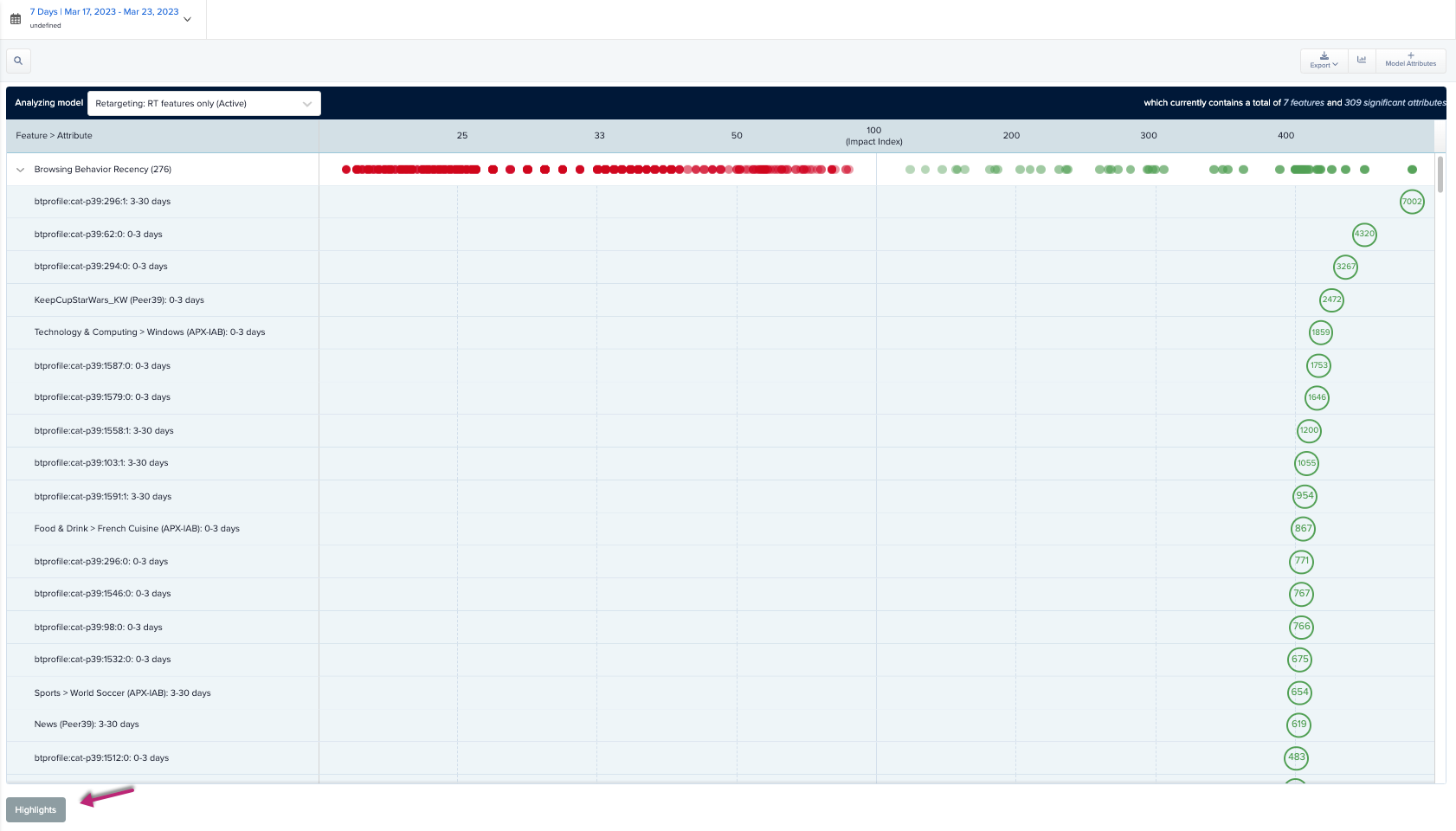 The Model Attributes report opens the hood of the models used on your campaign. It shows each feature and attribute used to make decisions by Zeta's AI, and how these attributes are scoring for your campaign. This report can be filtered to show the data gathered by the individual models used in your campaign. The Highlights section provides bullets of summary text about what the model has learned, and which features are providing the most impact.