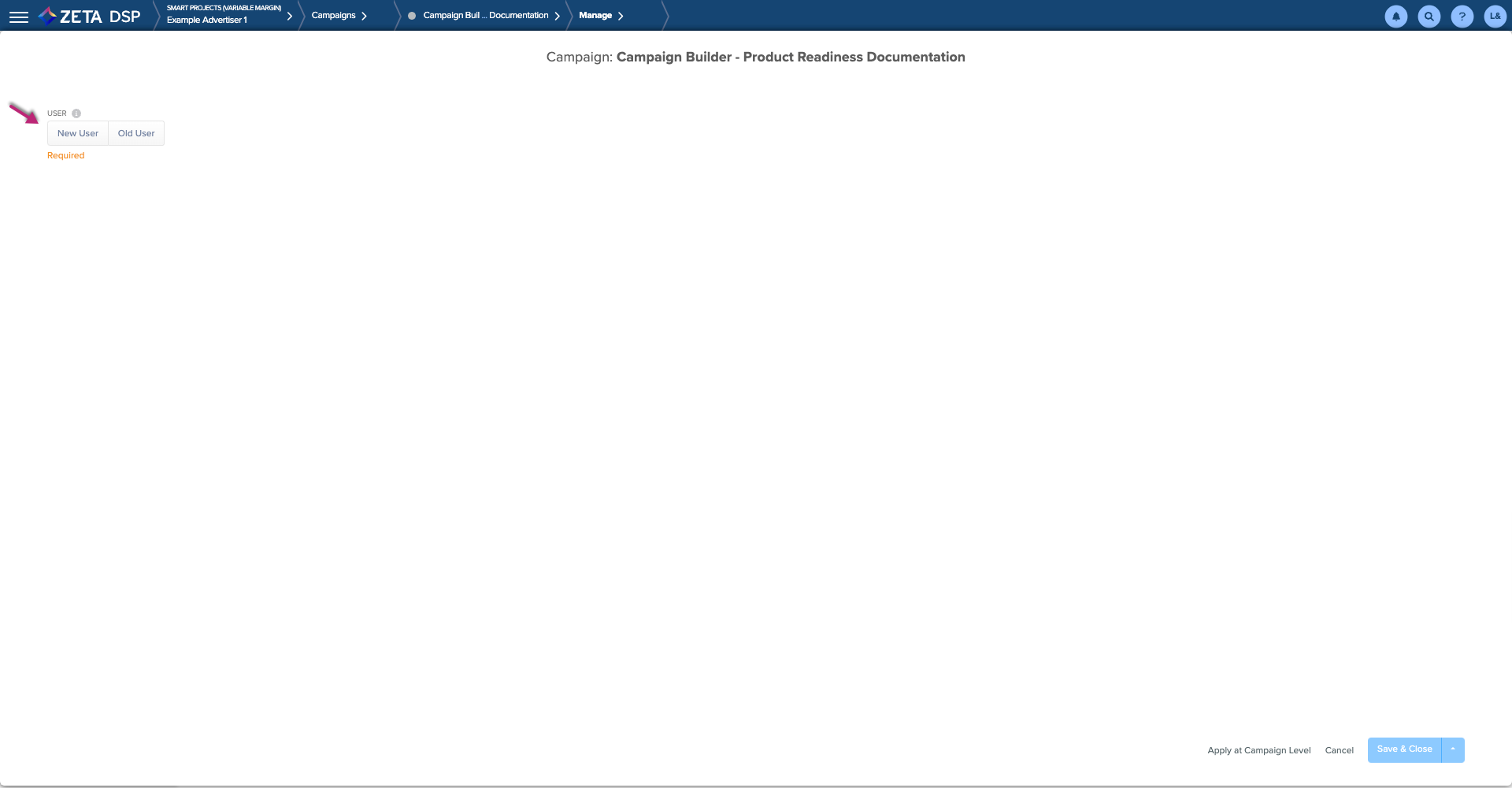 You can also use New User targeting to target Old Users, which means the DSP will target users that Zeta has previously delivered pixels for or users that Zeta has recorded at least one attribute of.