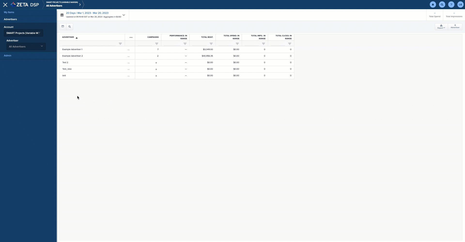 1. Click on the DSP logo in the upper left corner. Within the menu that appears for Advertisers and Admin, select your desired account and advertiser.