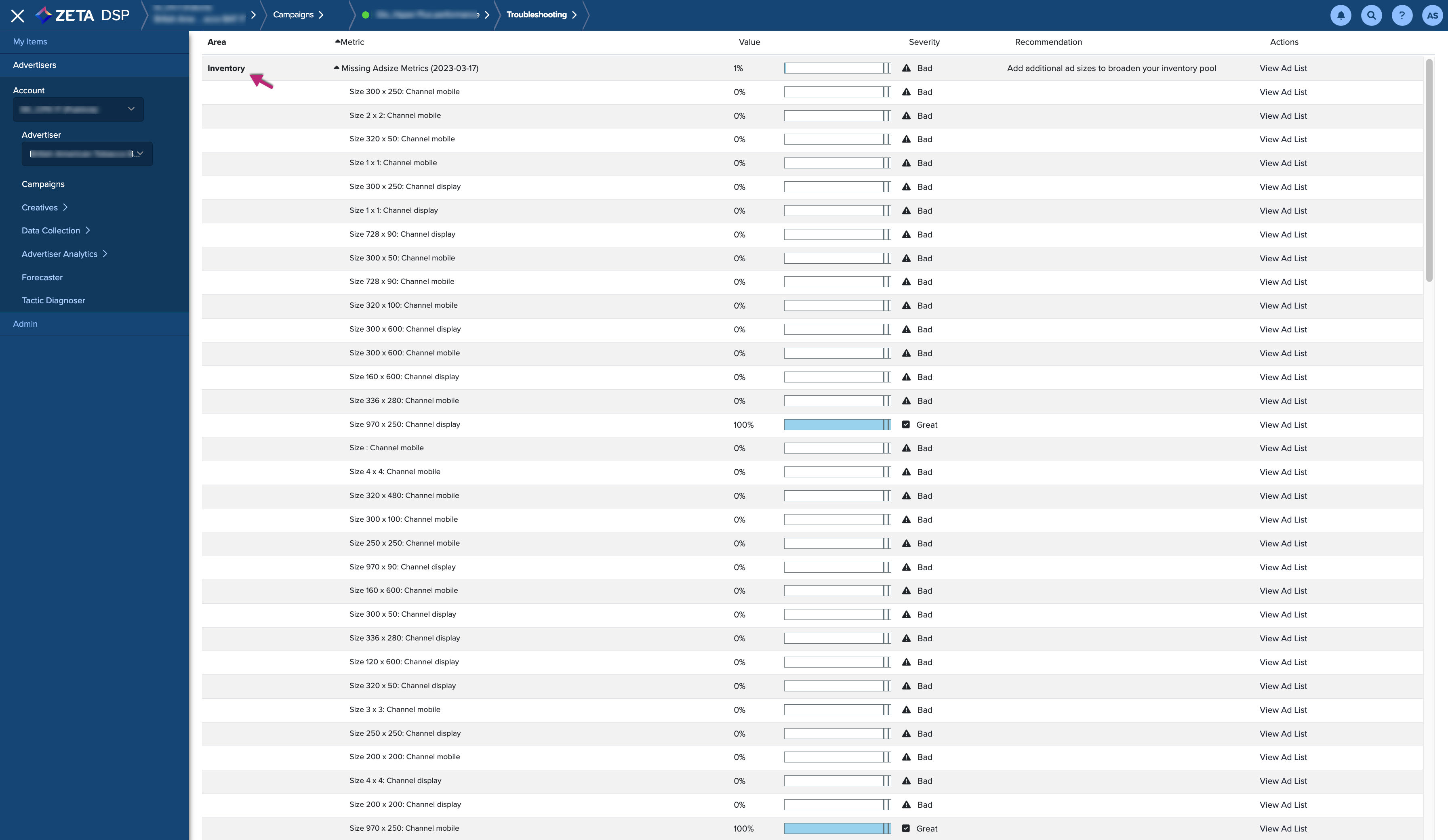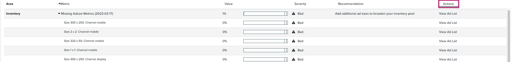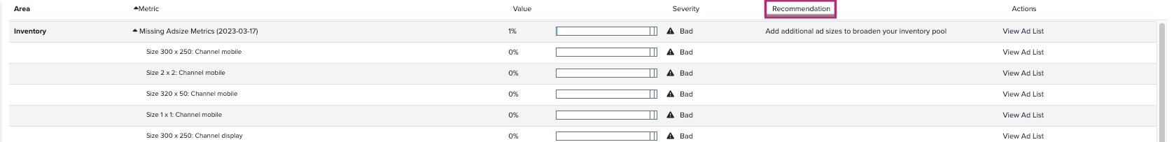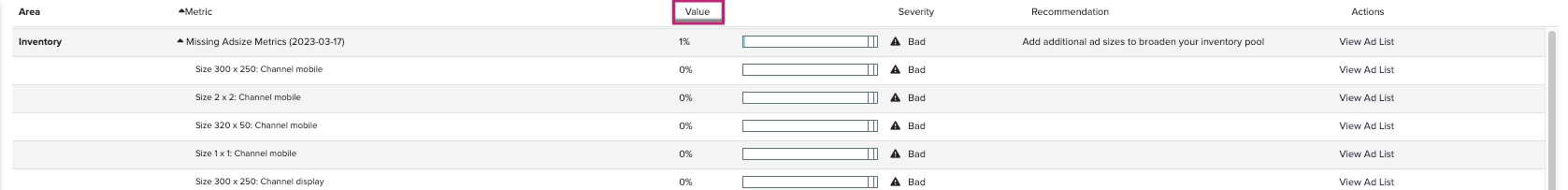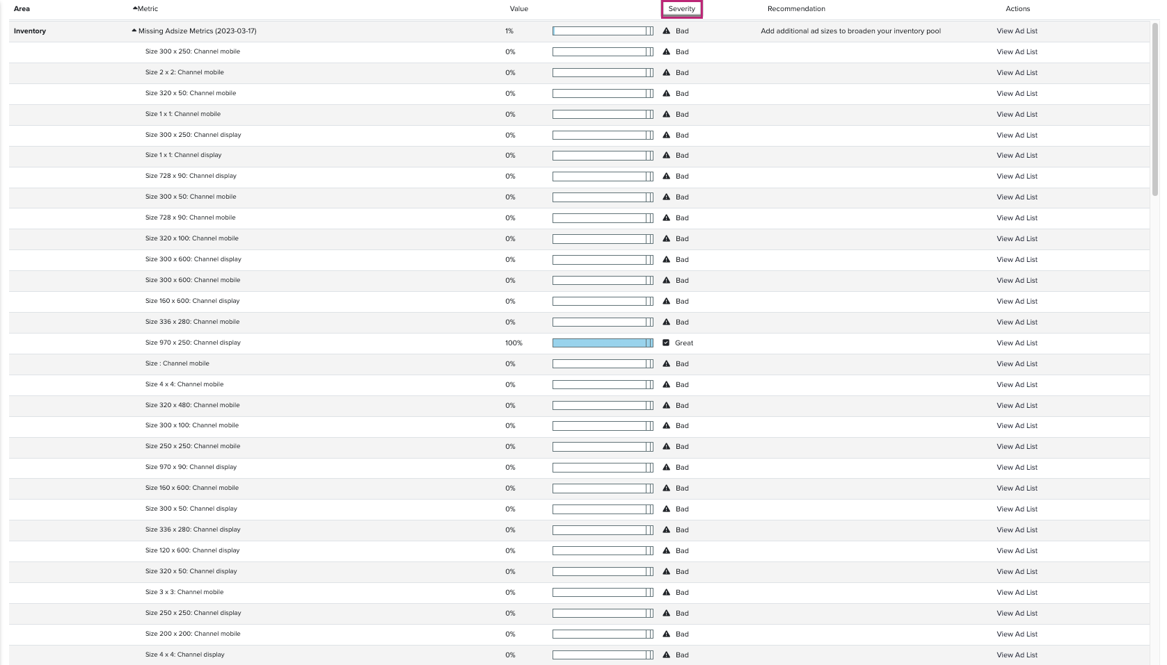 Missing Ad size Metrics | Measures the extent to which the campaign's ability to bid on Ad placement opportunities is hampered by not having Ads in one or more particular sizes. If you have problems in this area, identify the missing sizes, provide Ads for them and get the new Ads approved. |