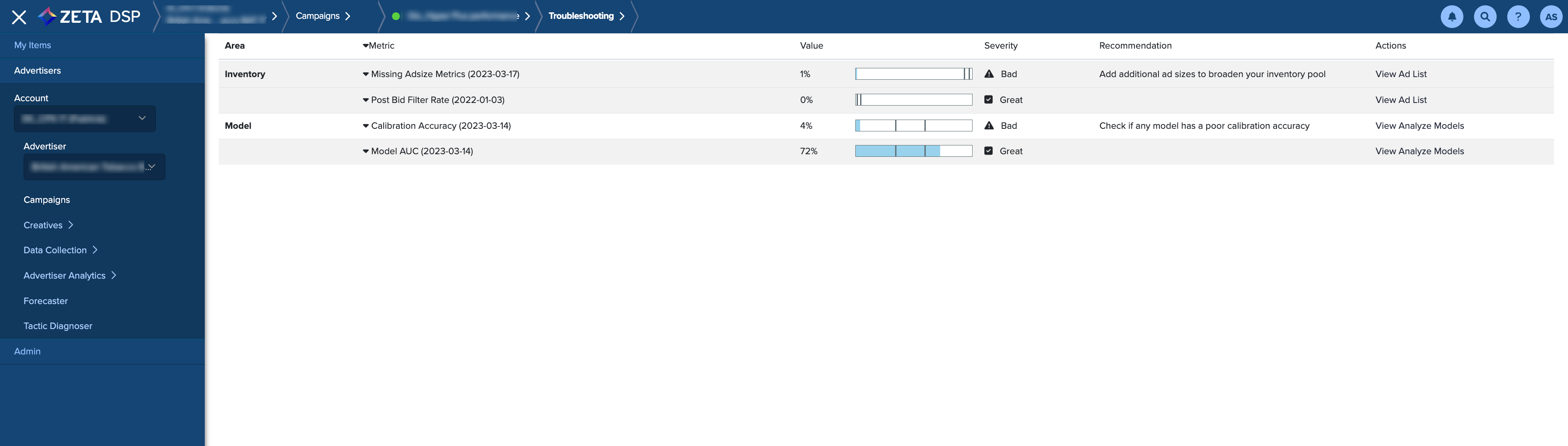 The Campaign Troubleshooting screen ties together a variety of campaign-level metrics to provide a single, concise analysis of your campaign's performance to date.